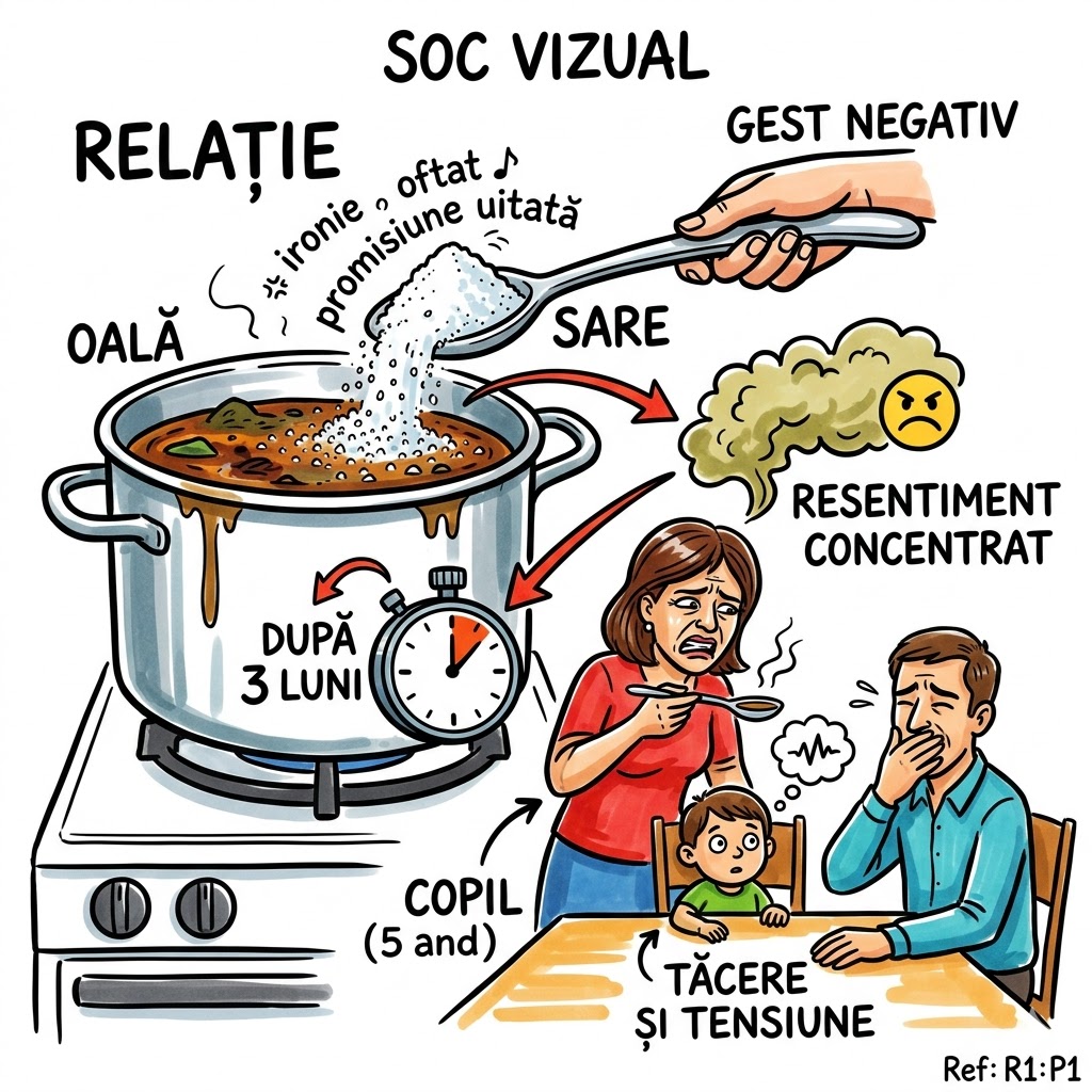 Imagineaza-ti ca relatia de cuplu e o oala mare pe aragaz. Fiecare gest negativ β o ironie muScatoare, un oftat teatral, o promisiune uitata β e o lingura de sare aruncata in ciorba. O lingura nu strica ciorba. Doua, merge. Dar daca arunci sare fara sa adaugi legume, condimente, apa proaspata, dupa 3 luni gusti si simti pe limba acel gust acru-metalic care te face sa strangi din buze β gustul resentimentului concentrat. Mama Geta a ignorat reteta asta un an intreg. Punea sare (reprosuri la micul dejun, ofte la cina, priviri reci la TV) si uita complet de legume (un "multumesc ca ai dus gunoiul", o mangaiere pe mana in masina, un "poveSteSTe-mi despre ziua ta" ascultat fara telefon in mana). Dupa 12 luni, "ciorba" relatiei era atat de sarata incat partenerul ei nu mai voia sa guste. Statea la masa cu lingura in mana, uitandu-se in oala, si simtea doar gustul acela care arde. Copilul de 5 ani, intre timp, a invatat ca "la masa" inseamna tacere si tensiune β nu miros de mancare si ras.