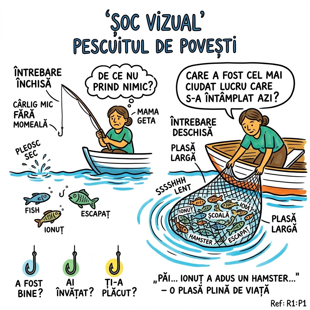 Imagineaza-ti ca esti pescar. La cina, arunci undita in oceanul vietii copilului, sperand sa prinzi ceva. Intrebarea Inchisa este un carlig mic, fara momeala, aruncat in apa cu un "pleosc" scurt si retras imediat: "A fost bine?" β trage cΓ’rligul: gol. "Ai invatat?" β trage: gol. "Ti-a placut?" β trage: gol. Trei aruncari, niciun peste. Mama Geta pescuia asa in fiecare seara si se intreba de ce "nu prinde nimic". Intrebarea Deschisa este o plasa larga, aruncata cu rabdare, care pluteste in apa si lasa pestii (povestile) sa intre singuri: "Care a fost cel mai ciudat lucru care s-a intamplat azi?" β plasa tremura β "Pai... Ionut a adus un hamster la scoala si a scapat in clasa!" β si deodata ai o plasa plina de viata copilului tau pe care altfel nu ai fi stiut-o. Sunetul plasei care se umple de apa β acel "sssshhh" lent al informatiei care intra β e atat de diferit de "pleosc"-ul sec al intrebarii inchise care aterizeaza si revine goala.
