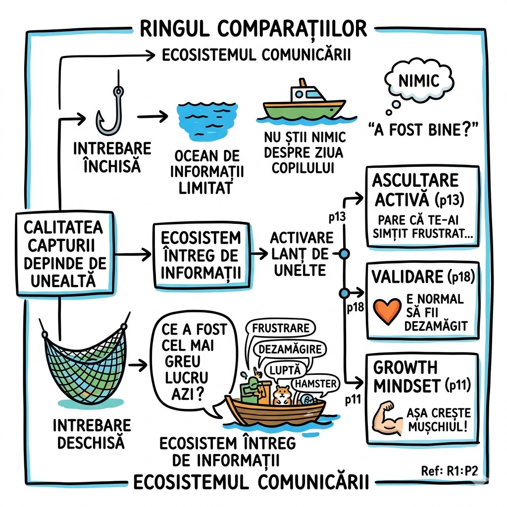 π₯ Ringul Comparatiilor: Intrebarile Deschise vs. Inchise in comunicarea cu copilul functioneaza exact ca doua tehnici de pescuit: intrebarea inchisa = un carlig mic fara momeala ("A fost bine?" β trage: nimic), intrebarea deschisa = o plasa larga aruncata cu rabdare ("Ce a fost cel mai greu lucru azi?" β plasa revine plina de informatii). La pescuit, calitatea capturii depinde de unealta. In familie, calitatea conexiunii depinde de tipul intrebarii. Diferenta: pescarul cu carlig gol nu stie ce e in ocean (nu stii nimic despre ziua copilului). Pescarul cu plasa descopera un ecosistem intreg. Si cel mai mare beneficiu: odata ce ai prins ceva cu plasa (copilul a inceput sa povesteasca), poti folosi Ascultarea Activa (p13 β "Pare ca te-ai simtit frustrat..."), Validarea (ce va urma in p18 β "E normal sa fii dezamagit") si Growth Mindset (p11 β "E grozav ca te-ai luptat cu ea! Asa creste muschiul!") β o singura intrebare deschisa activeaza intregul lant de unelte.