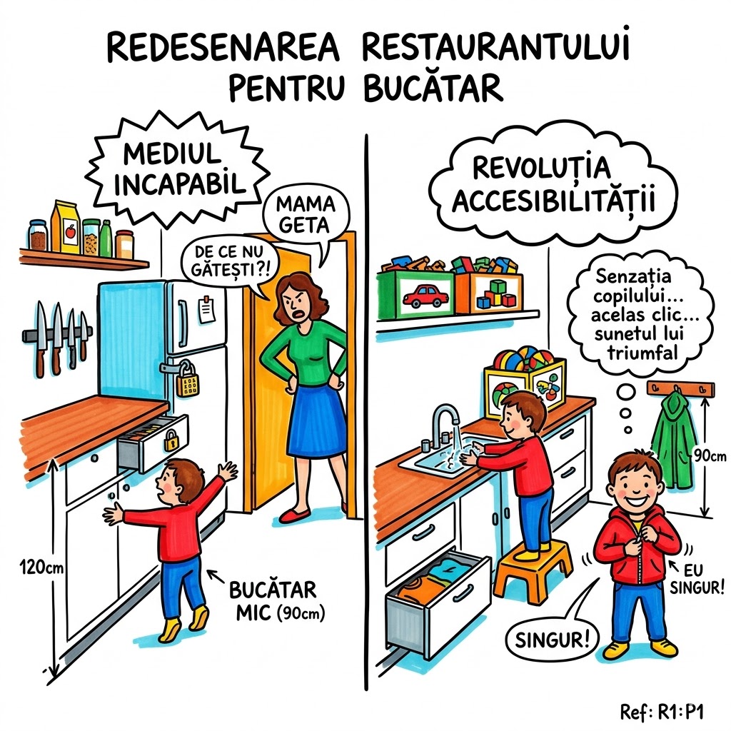 Imagineaza-ti un restaurant cu un bucatar nou, talentat, entuziast β dar care masoara 90cm. Blatul de lucru e la 120cm. Cutiitele sunt in sertarul de sus, incuiat. Frigiderul necesita un cod pe care nu-l stie. Ingredientele sunt pe raftul de deasupra frigiderului. Bucatarul sta in mijlocul bucatariei, cu bratele intinse, incapabil sa atinga ceva β si managerul urla din usa: "DE CE NU GATESTI?! Esti incapabil!" Mama Geta era acel manager. "De ce nu te imbraci singur?!" β dar hainele erau pe umerasul de la 180cm. "De ce nu te speli pe maini?!" β dar chiuveta era inaccesibila fara scaunel. "De ce nu-ti strangi jucariile?!" β dar toate 200 de jucarii erau intr-un morman amorf dintr-un cos urias, imposibil de organizat pentru un creier Preoperational (p9). Cand Mama Geta a cobarat cuierul la 90cm, a pus un scaunel la chiuveta, a organizat jucariile in 3 cutii cu poze si a pus hainele in sertare accesibile β copilul a inceput sa faca singur in 48 de ore. Nu pentru ca a "crescut" peste noapte, ci pentru ca restaurantul a fost redesenat pentru bucatar. Senzatia copilului care ajunge pentru prima data la cuier singur si-si pune geaca β acel clic al fermoarului tras cu degetele lui mici, sunetul lui triumfal β e sunetul misiunii "Eu Singur!" (Erikson, p10) castigate.