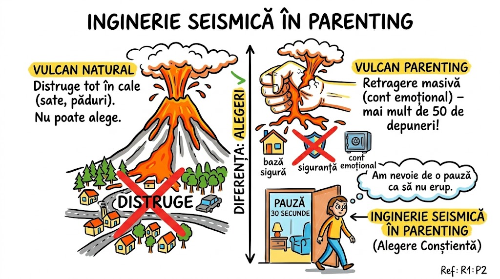 π₯ Ringul Comparatiilor: "Pumnul Intelept" functioneaza exact ca un vulcan cu crusta activa: cat timp crusta (cortexul prefrontal β logica, empatie) e intacta, vulcanul arata calm de la suprafata, chiar daca magma (amigdala β frica, furie) fierbe in adancime. Dar cand presiunea depaseste rezistenta crustei, eruptia este instantanee si necontrolata β nu iese putin fum si te opresti; iese tot. La vulcan, eruptia distruge tot ce e in cale β sate, paduri, drumuri. In parenting, eruptia (tipatul, lovirea mesei, cuvintele pe care nu le voiai) distruge exact ce ai construit cu rabdare: increderea copilului (Baza Sigura, p5), sentimentul de siguranta (SAFE din 4 S, p8), si "contul emotional" (5:1, p1) β o singura eruptie poate retrage din cont mai mult decat 50 de depuneri mici. Diferenta: vulcanul nu poate alege sa nu erupA. Tu poti invata sa recunosti semnele de presiune inainte ca crusta sa crape si sa iesI din incapere 30 de secunde ("Am nevoie de o pauza ca sa nu erup") β asta nu e slabiciune, e inginerie seismica aplicata la parenting.