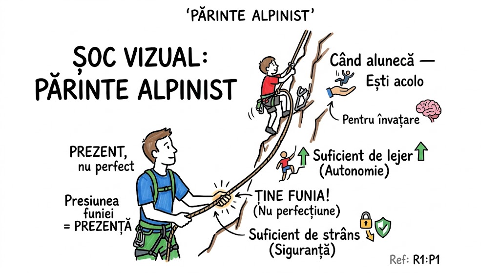 Imagineaza-ti ca esti alpinist si tii funia pentru copilul tau care urcA peretele. Nu trebuie sa fii alpinistul perfect β nu trebuie sa cunosti fiecare ruta, sa ai echipament de competitie, sa nu-ti alunece niciodata piciorul. Trebuie doar sa TINI FUNIA. Suficient de strans incat sa nu cada (siguranta de baza). Suficient de lejer incat sa urce singur (autonomie, p10). Si cand aluneca β pentru ca VA aluneca β sa fii acolo sa opresti caderea, nu sa o previi (pentru ca preventirea permanenta impiedica invatarea). Mama Geta credea ca trebuie sa fie alpinistul olimpic β sa cunoasca fiecare piatra, sa anticipeze fiecare alunecare, sa construiasca scari suplimentare pentru fiecare treapta. Si pentru ca nu putea fi perfecta, se simtea o esecata permanenta. Nu stia ca tot ce trebuie sa faca e sa tina funia β nu perfect, nu constant, dar SUFICIENT. Senzatia funiei in palma β acea presiune constanta care iti aminteste ca cineva depinde de tine dar nu trebuie sa-l cari β e ce inseamna "suficient de bun": prezent, nu perfect.