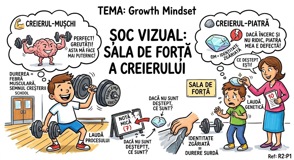 Imagineaza-ti doi copii la sala de forta a scolii. Copilul 1 crede ca are un muschi mic in cap β "Creierul-Muschi" πͺ. Stie ca, daca merge la sala (studiaza, exerseaza, greseste), muschiul creste. Cand da de o greutate mare (problema grea), zice: "Perfect! Greutati! Asta ma face mai puternic!" Dupa antrenament il doare (nota mica) β dar stie ca durerea e febra musculara, semnul ca muschiul creste. Copilul 2 crede ca are o piatra pretioasa in cap β "Creierul-Piatra" πͺ¨. Treaba lui e sa o protejeze. Sa n-o zgarie nimeni. Cand vede greutatile (problema grea), fuge: "Daca incerc si nu ridic, inseamna ca piatra mea e defecta!" Mama Geta, fara sa stie, ii lustruia piatra copilului. "Ce destept esti!" dupa fiecare 10. "Esti talentata la desen!" dupa fiecare soare desenat. Intr-o zi, copilul a primit un 7. Piatra s-a zgariat. A plans isteric β nu din cauza notei, ci din cauza identitATii: "Daca nu sunt destept, ce sunt?" A simtit o durere surdA in piept, ca atunci cand strangi prea tare o piatra in pumn si muchiile ti se imprima in palma β nu sange, dar o senzatie de presiune care nu trece.