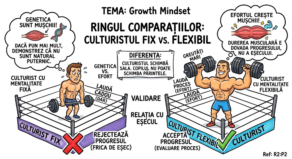 π₯ Ringul Comparatiilor: Growth Mindset functioneaza exact ca diferenta dintre doua filozofii la sala de forta: un culturist cu mentalitate fixa crede ca muschii sai sunt genetici β "ma nasc puternic sau nu" β si refuza sa ridice greutati mai mari de frica ca va demonstra ca nu e "natural puternic". Un culturist cu mentalitate flexibila stie ca muschii cresc prin efort progresiv β fiecare antrenament greu il face mai puternic, iar durerea musculara de a doua zi e dovada progresului, nu a esecului. Aplicat la copil: "Ce destept esti!" (lauda genetica) e echivalentul lui "Esti natural puternic!" β bine atata timp cat ridici usor, catastrofal cand dai de greu. "Vad ca ai muncit mult!" (lauda procesului) e echivalentul lui "Ai antrenat serios!" β functioneaza indiferent de rezultat, pentru ca valideaza efortul, nu darul. Diferenta: culturistul poate schimba sala. Copilul nu-si poate schimba parintele β asa ca felul in care tu etichetezi inteligenta ("dar" vs. "muschi") ii defineste relatia cu esecul pe viata.