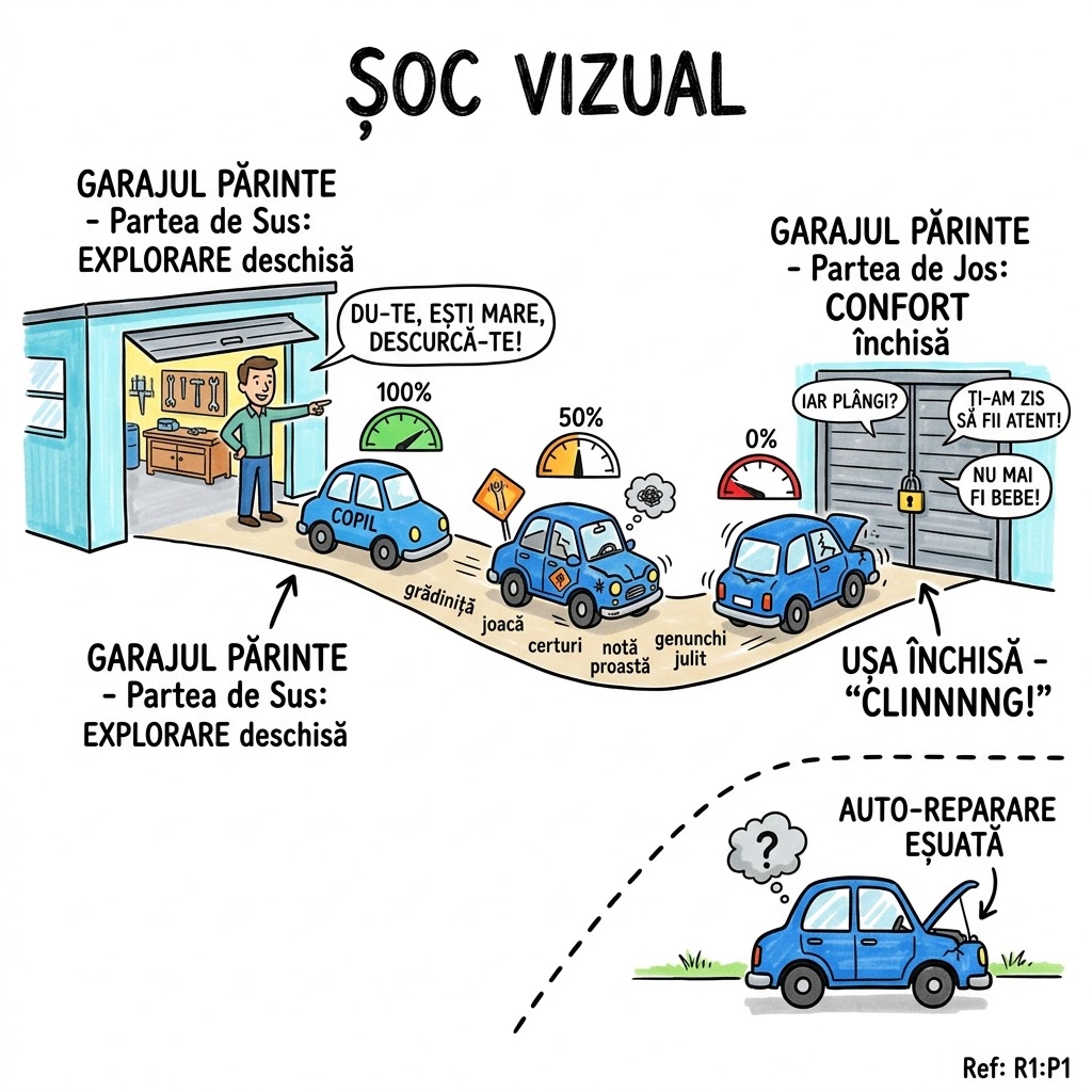Imagineaza-ti copilul ca o masina mica care pleaca dimineata din garajul tau cu rezervorul plin de benzina. Tu esti garajul β cald, luminat, cu toate uneltele la locul lor. Masina parcurge drumul zilei: gradinita, joaca, certuri cu alti copii, o nota proasta, un genunchi juliet. La fiecare eveniment, benzina scade: 80%... 50%... 30%. Cand ajunge pe rosu, masina se intoarce tremuranad in garaj. Tatal Mitu era un garaj selectiv. La "Partea de Sus" (explorare), era campion: "Du-te, esti mare, descurca-te!" Dar la "Partea de Jos" (confort), inchidea usa garajului: "Iar plangi? Ti-am zis sa fii atent! Nu mai fi bebe!" Masina mica a auzit sunetul metalic al usii de garaj β clinnnng β inchizandu-se exact cand avea cel mai mult nevoie de reparatii. Dupa cativa ani, masina mica a incetat sa mai vina la garaj cand era pe rosu. Se oprea pe marginea drumului si incerca sa se repare singura, cu capota sus, fara unelte β si fara niciun mecanic care s-o intrebe "Ce s-a stricat?"
