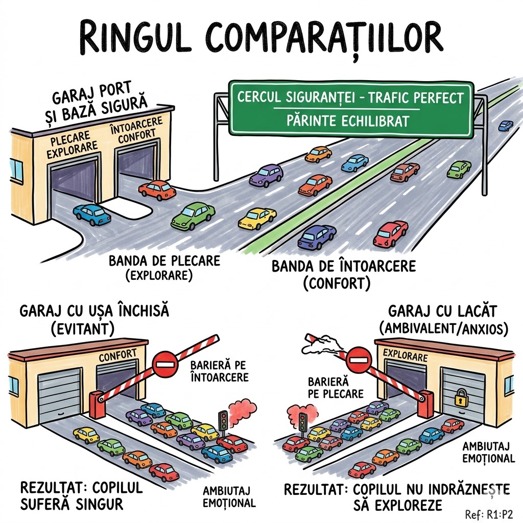 π₯ Ringul Comparatiilor: Cercul Sigurantei in atasamentul parinte-copil functioneaza exact ca un sistem de trafic cu doua benzi: banda de plecare (explorare β copilul iese in lume cu curaj pentru ca stie ca garajul e in spate) si banda de intoarcere (confort β copilul revine pentru "reparatii" emotionale cand ceva merge prost). Un parinte echilibrat tine ambele benzi deschise. Dar unii tin deschisa doar banda de plecare ("Mergi, descurca-te, nu fi moale!") si pun bariera pe banda de intoarcere β sunt "garaje cu usa inchisa", grozave la incurajare dar reci la confort. Altii tin deschisa doar banda de intoarcere ("Stai cu mine, e periculos afara!") si bariera pe banda de plecare β sunt "garaje cu lacat", calde dar sufocante. Diferenta: la trafic, o bariera pe o banda creeaza ambuteiaj. In atasament, o bariera pe una din jumatati creeaza un copil care fie nu mai cere confort cand sufera (si invata sa sufere singur), fie nu mai indrazneste sa exploreze (si nu isi dezvolta niciodata competenta).