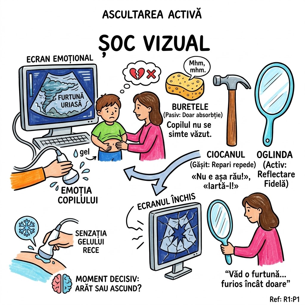 Imagineaza-ti ca emotia copilului tau este o imagine pe un ecran de ecograf β asa cum medicul vede bebelusul in burta mamei, tu "vezi" ce se intampla in interiorul copilului tau, dar doar daca pui sonda corect si astepti. Mama Geta avea trei unelte in fata: Buretele π§½ (Ascultarea Pasiva β absorbi tacuta, dai din cap, nu faci nimic β "Mhm, mhm" β dar copilul nu se simte vazut, doar auzit). Ciocanul π¨ (Ascultarea Gresita β te repezi sa repari inainte sa fi vazut imaginea completa: "Nu e asa rau! Trebuie sa-l ierti pe Ionut!"). Si Oglinda πͺ (Ascultarea Activa β pui sonda pe burta emotionala si reflectezi exact ce vezi, fara sa adaugi, fara sa stergi: "Vad o furtuna uriasa acolo inauntru. Esti atat de furios incat doare"). Mama Geta a ales Ciocanul ani de zile. Copilul a invatat ca emotiile lui sunt "de reparat", nu "de ascultat". Si a incetat incet-incet sa mai arate ecranul nimanui. Senzatia gelului rece de ecograf pe piele β acel contact care te face sa inspiri scurt β e momentul in care copilul decide daca sa-ti arate ce are inauntru sau sa-si intoarca ecranul cu fata-n jos.