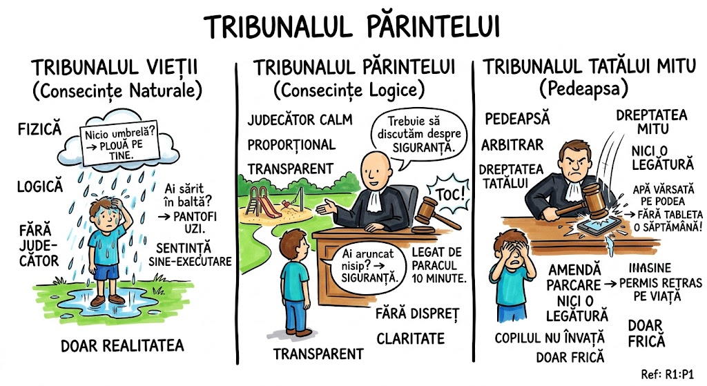 Imagineaza-ti doua tribunale. Tribunalul Vietii (Consecinte Naturale): nu are judecator, nu are avocat, nu are juriu β are doar fizica si logica. "Ai iesit fara umbrela? β Ploua pe tine." Sentinta se executa singura. Nimeni nu tipa, nimeni nu rusineaza. Doar realitatea care raspunde. Tribunalul Parintelui (Consecinte Logice): are un judecator calm, proportional si transparent. "Ai aruncat nisip in ochii colegului? β Parasim parcul 10 minute ca sa discutam despre siguranta." Sentinta e legata de "infractiune", proportionala, si judecatorul (parintele) o explica fara dispret. Apoi exista Tribunalul Tatalui Mitu (Pedeapsa): copilul varsase apa pe podea β "FARA TABLETA O SAPTAMANA!" Ce legatura are tableta cu apa? Niciuna. E ca un judecator care, pentru o amenda de parcare, ar retrage permisul de conducere pe viata. Copilul nu invata "apa varsata se sterge" β invata "tata e arbitrar si trebuie sa ma feresc de el." Sunetul ciocanelor de judecator β acel "toc!" sec care inchide dezbaterea β daca e corect aplicat, aduce claritate. Daca e arbitrar, aduce doar frica.