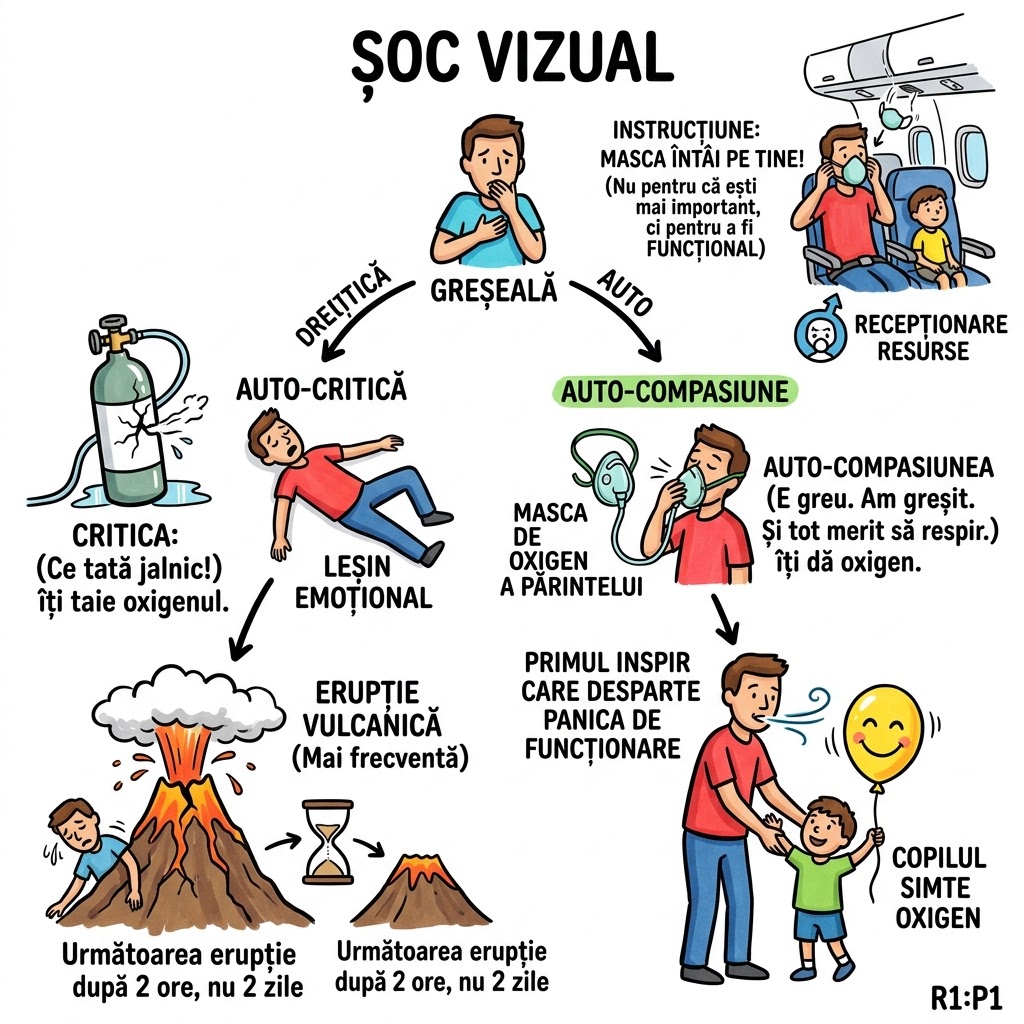 Imagineaza-ti ca esti in avion cu copilul tau si masca de oxigen cade. Instructiunea e clara: pune masca INTAI pe tine, apoi pe copil. Nu pentru ca esti mai important β ci pentru ca, daca leSini (nu ai oxigen), nu poti ajuta pe nimeni. Auto-compasiunea e masca de oxigen a parintelui. Daca iti vorbesti cu Critica ("Ce tata jalnic!"), iti tai singur oxigenul β devii si mai epuizat, si mai fragil, si mai predispus sa "erupi" data viitoare. Daca iti pui "masca" ("E greu. Am gresit. Si tot merit sa respir."), ai oxigen suficient sa-l ajuti si pe copil. Tatal Mitu leSina emotional dupa fiecare eruptie β nu pentru ca eruptia era atat de mare, ci pentru ca dupa eruptie isi taia singur oxigenul cu 30 de minute de auto-critica. Dupa 30 de minute fara oxigen, "crusta" vulcanului era si mai subtire. Si urmatoarea eruptie venea dupa 2 ore, nu dupa 2 zile. Senzatia mastii de oxigen pe fata β acel prim inspir care desparte panica de functionare β e ce simti cand alegi sa-ti vorbesti cu blandete in loc de dispret.