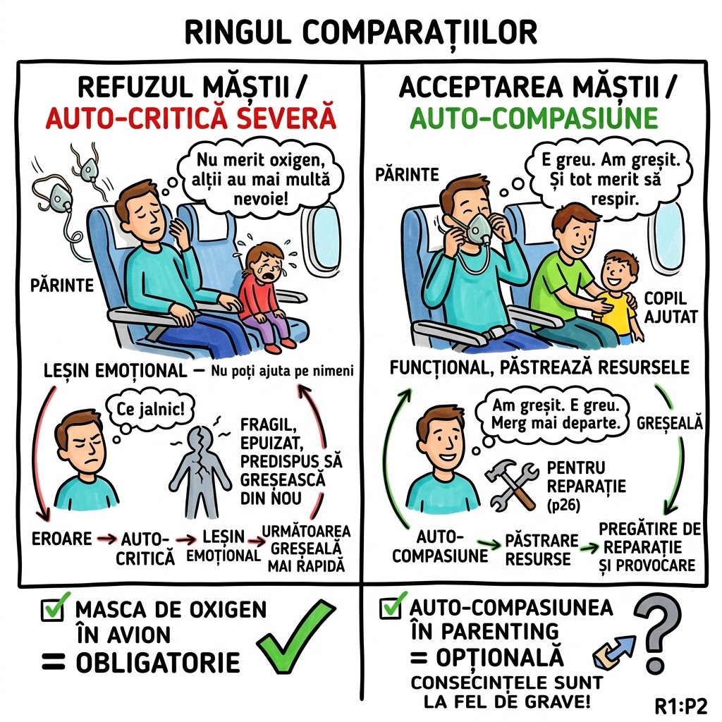 π₯ Ringul Comparatiilor: Auto-compasiunea functioneaza exact ca masca de oxigen in avion: un pasager care refuza sa-si puna masca ("Nu merit oxigen, alTii au mai multa nevoie!") leSinA si nu mai poate ajuta pe nimeni β nici pe copil, nici pe altii. Un pasager care isi pune masca intai nu e egoist β e functional. In parenting: un parinte care se auto-critica sever dupa fiecare greseala ("Ce jalnic!") nu devine "mai bun" β devine mai fragil, mai epuizat si mai predispus sa greseasca din nou. Un parinte care practica auto-compasiunea ("Am gresit. E greu. Merg mai departe.") isi pastreaza resursele pentru reparatie (p26) si pentru urmatoarea provocare. Diferenta: masca de oxigen in avion e obligatorie. Auto-compasiunea in parenting e optionala β dar consecintele lipsei ei sunt la fel de grave.