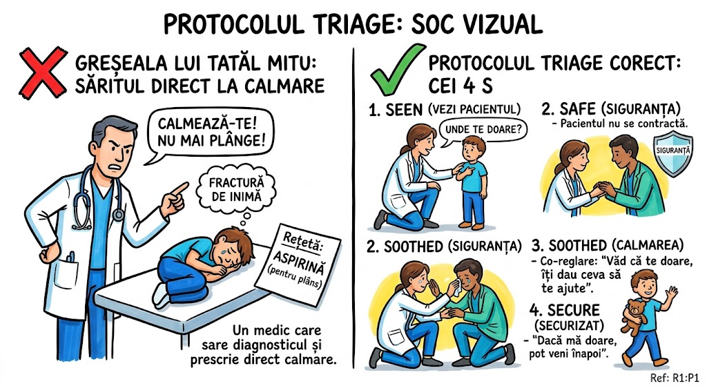 Imagineaza-ti ca esti medic de urgenta si un copil vine la triaj. Protocolul are 4 pasi obligatorii, in ordine: Pasul 1 β SEEN (Diagnosticul): Trebuie sa-l VEZI pe pacient. Nu simptomele, nu fisa, ci pacientul. "Unde te doare cu adevarat?" β nu "Hai repede, urmatorul!" Pasul 2 β SAFE (Siguranta): Pacientul trebuie sa se simta in siguranta in mainile tale. Daca doctorul tipa sau e nervos, pacientul se contracta si nu mai spune unde-l doare. Pasul 3 β SOOTHED (Calmarea): Ii calmezi durerea. Nu ii spui "Nu te doare asa tare!" (invalidare), ci "Vad ca te doare, iti dau ceva sa te ajute" (co-reglare). Pasul 4 β SECURE (Securizat): Pacientul pleaca stiind: "Daca ma doare din nou, pot veni inapoi si voi fi primit la fel." Tatal Mitu era medicul care sareau direct la Pasul 3: "Calmeaza-te! Nu mai plange!" β fara sa fi facut niciodata Pasul 1 (sa vada CE simte copilul) si fara Pasul 2 (sa nu-l sperie cu vocea ridicata). Prescria "aspirina" (ordine de a se opri din plans) pentru o "fractura de inima" (nevoia de a fi inteles). Bineinteles, "aspirina" nu functiona β si Tatal Mitu se intreba, sincer perplex, de ce "tratamentul" nu are efect. Sunetul stetoscopului pus direct pe piele rece β acel contact neasteptaT care te face sa tresari β asta simte un copil cand ii ceri sa "se calmeze" fara sa-l fi "vazut" mai intai.