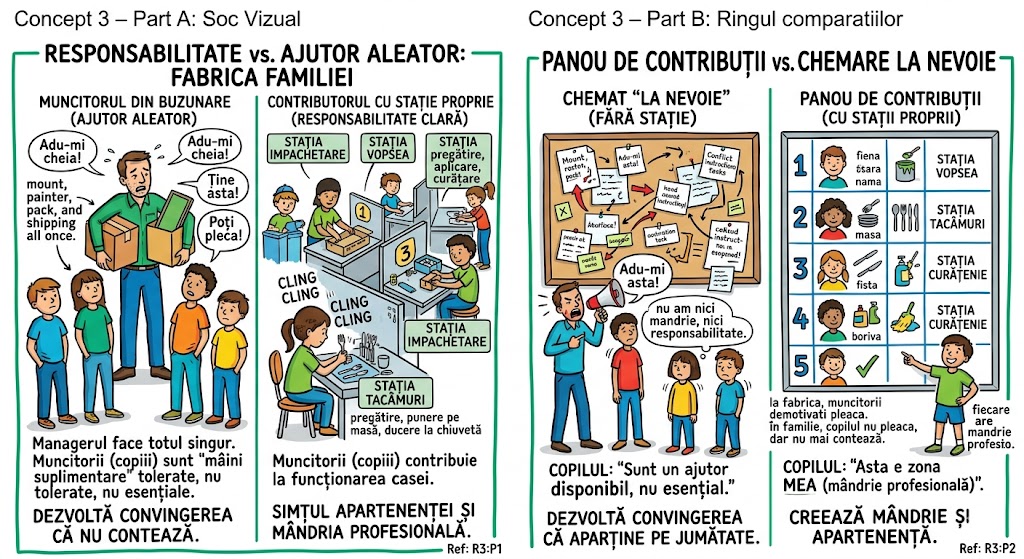 π₯ Ringul Comparatiilor: Panoul de Contributii in familie functioneaza exact ca statiile de lucru dintr-o fabrica eficienta: fiecare muncitor (membru al familiei) are o statie proprie cu responsabilitati clare, nu asteapta sa fie chemat "la nevoie" de manager. Un muncitor cu statie proprie are mandrie profesionala β "asta e zona MEA". Un muncitor chemat aleatoriu ("Adu-mi asta") nu are nici mandrie, nici responsabilitate β e un "ajutor" disponibil, nu un "contribuitor" esential. Diferenta: la fabrica, muncitorii fara statie sunt demotivati si pleaca. In familie, copilul fara "statie" (fara responsabilitate proprie) nu pleaca β dar dezvolta convingerea ca el nu conteaza in functionarea casei, ca apartine pe jumatate, si ca "treaba" e ceva ce fac altii.