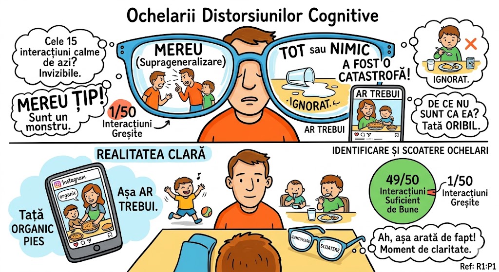 Distorsiunile cognitive sunt "ochelari cu lentile deformate" pe care parintele ii poarta fara sa stie β si care fac ca TOTUL sa para mai rau decat este. Cele mai frecvente la parinti: (1) Suprageneralizarea: "MEREU gresesc!" (un incident = regula universala); (2) Gandirea "Tot sau Nimic": "Daca nu fac totul perfect, sunt un parinte oribil" (nu exista nuante); (3) "Trebuie-smul": "Ar TREBUI sa fie usor! Alte mame par relaxate!" (standarde imposibile importate din Instagram). Tatal Mitu purta ochelarii "MEREU": "MEREU tip" (saptamana trecuta a tipat de 3 ori din 50 de interactiuni β 94% au fost calme, dar lentila "MEREU" le stergea pe cele 47 calme si le mareste pe cele 3 explozive). Scoate ochelarii, pune-i pe masa, uita-te cu ochii tai: realitatea e mai blanda decat lentilele.