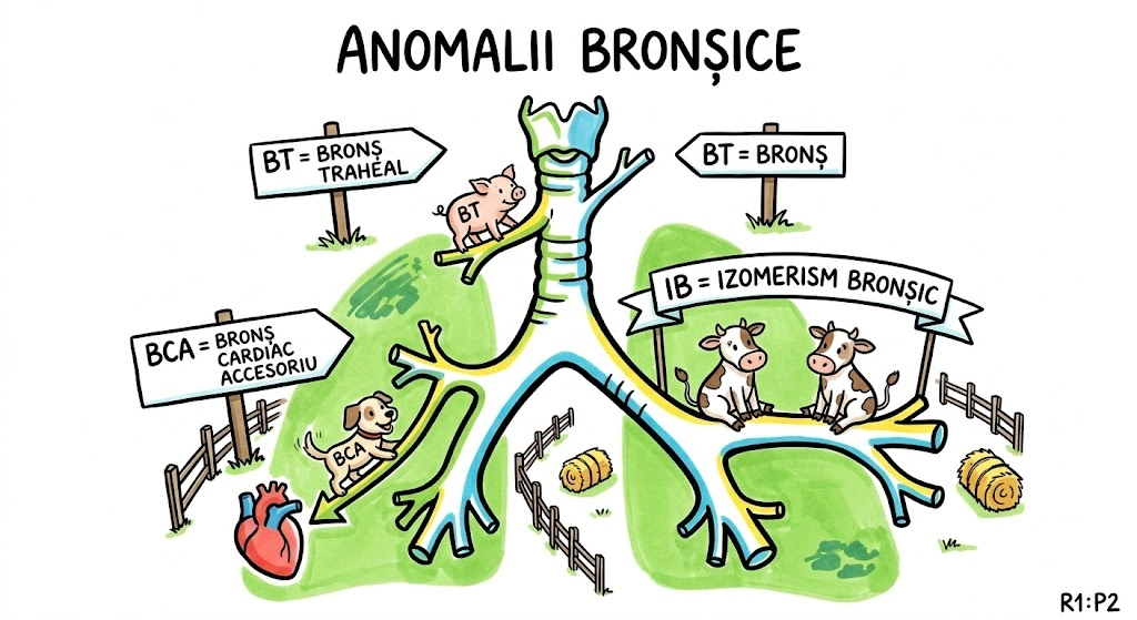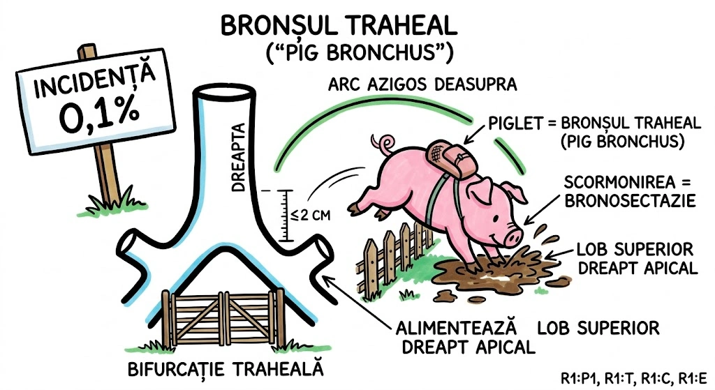 Ce Memoram: Trei anomalii bronsice cu incidenta de 0,1%: (1) Bronsul Traheal ("pig bronchus") — ia nastere din peretele traheal drept la ≤2 cm de bifurcatia traheala, alimenteaza apicalul lobului superior drept; (2) BCA — din bronsul intermediar, merge inferior si medial spre cord, de regula descoperire incidentala; (3) Izomerismul Bronsic — simetrie bilaterala, bilateral drept = asplenie, bilateral stang = polisplenie.