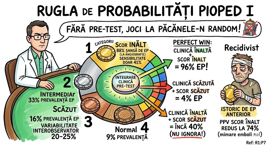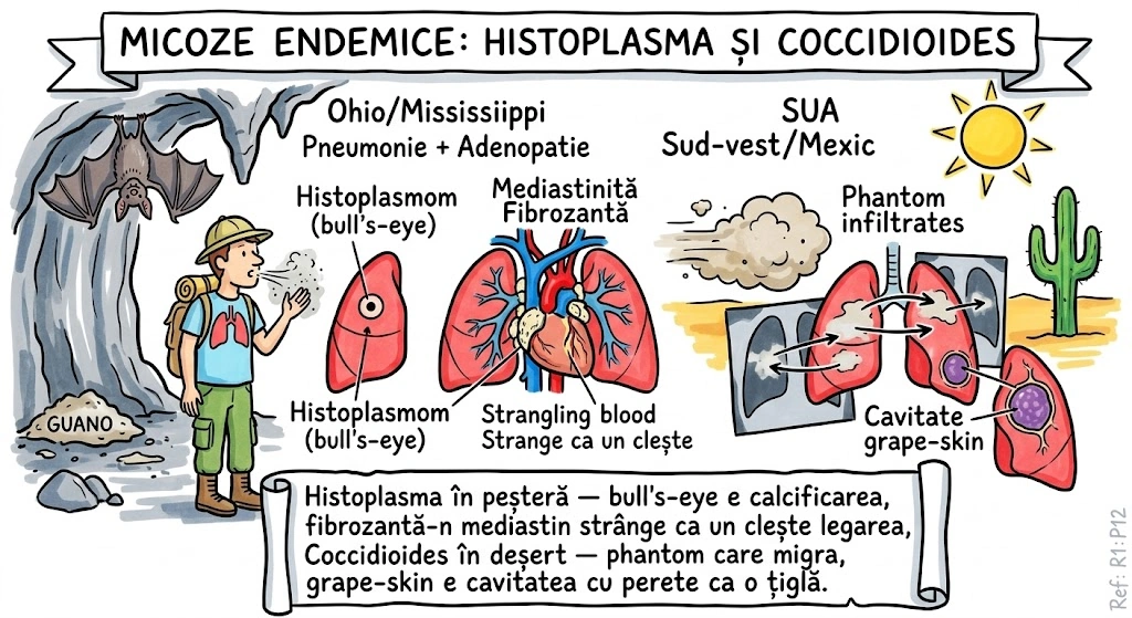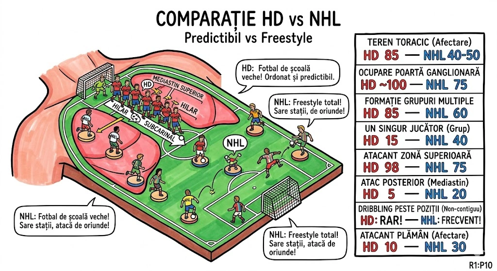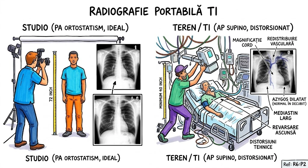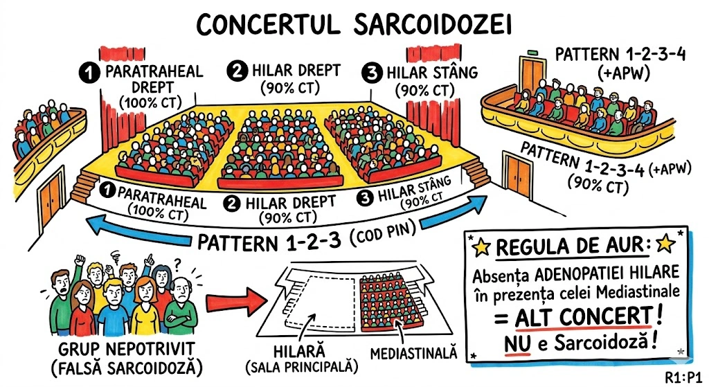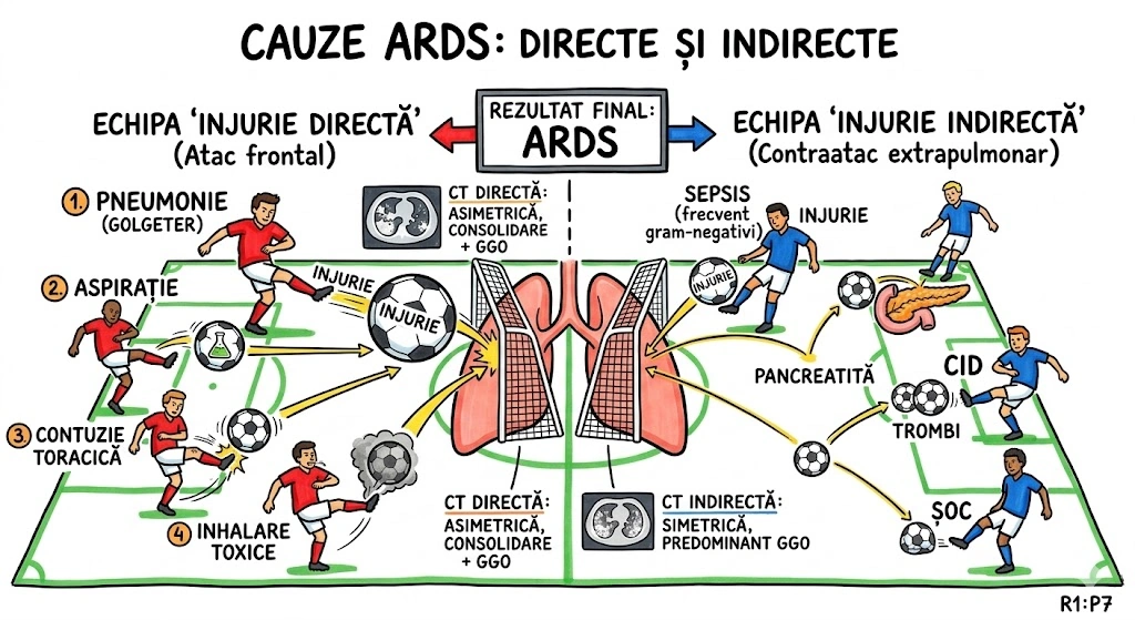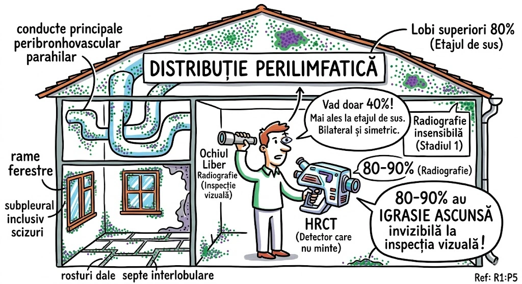 🥊 Ringul Comparatiilor: Pattern-ul bat-wing (perihilar) vs. pattern-ul periferic subpleural sunt opuse simetrice, ca doua echipe care ataca din directii opuse pe terenul de fotbal: edemul ataca din centru spre periferie (bat-wing), bolile cronice ataca din periferie spre centru (reverse bat-wing). Cand vezi pe Rx o consolidare si intrebi „de unde a inceput atacul?", raspunsul iti spune si cine ataca.
