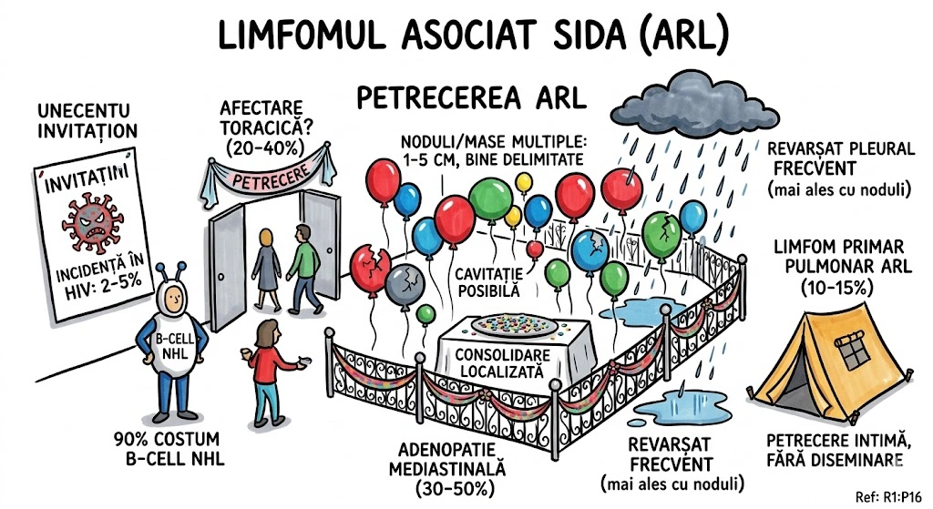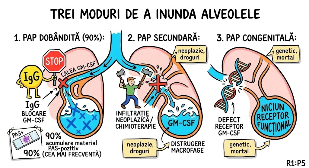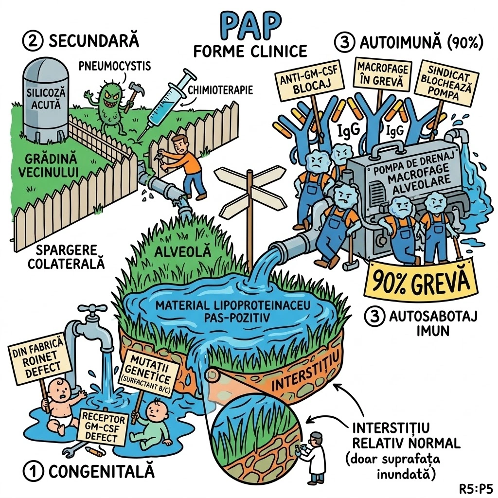 Supermarketul Alveolar — program non-stop, clienti nedoriti. Raftul cu APA: edemul pulmonar e clientul fidel, vine si hidrostatic si de permeabilitate, ocupa raft intreg. Raftul cu SANGE: hemoragia, vasculitele (Wegener, Goodpasture), contuziile — clienti rosii si agresivi. Raftul cu PUROI: pneumococul e seful de raft, dar TBC, fungii si PCP isi fac loc printre produse. Raftul cu CELULE: carcinomul bronhiolo-alveolar creste lepidic pe raft ca o planta agatatoare, limfomul ocupa spatiul prin forta, eozinofilele protesteaza cronic. Raftul cu ALTE: proteinoza si lipidele — produsele pe care nimeni nu le cumpara dar care nu expira niciodata. Casiera: „Aveti ASPCA complet? Sunt cinci categorii obligatorii in cosul diferentialului."