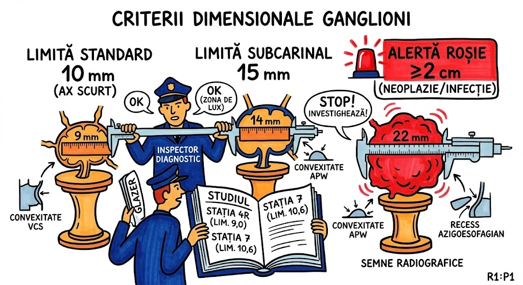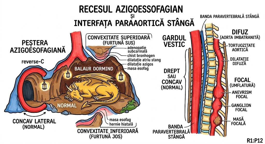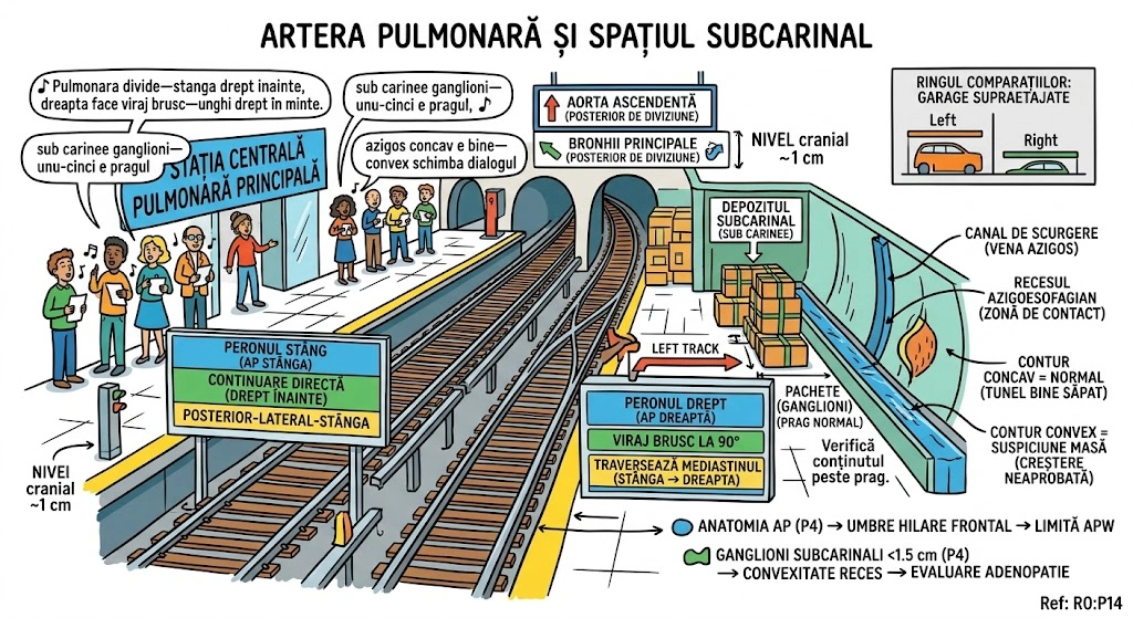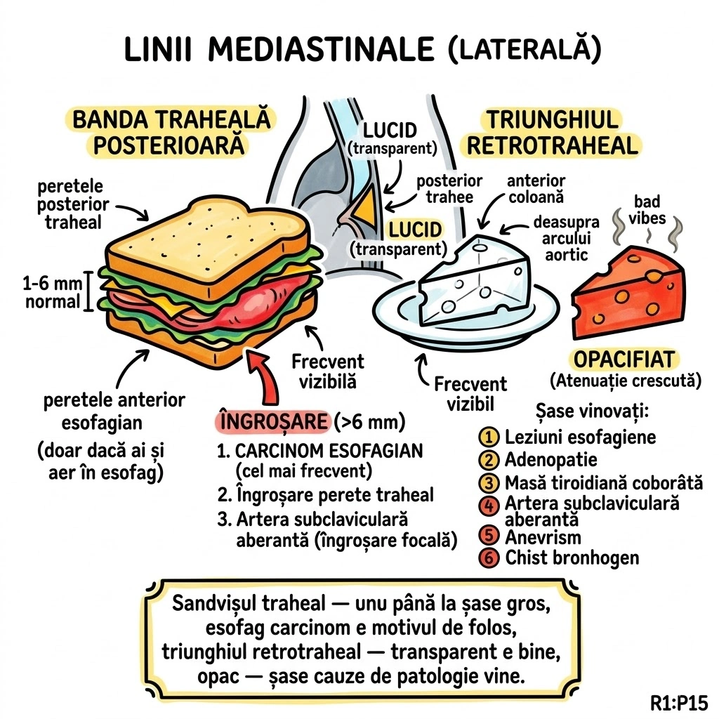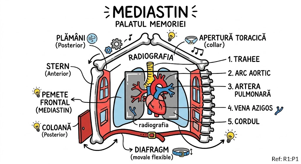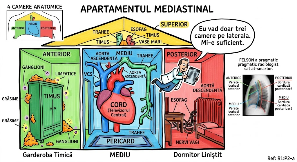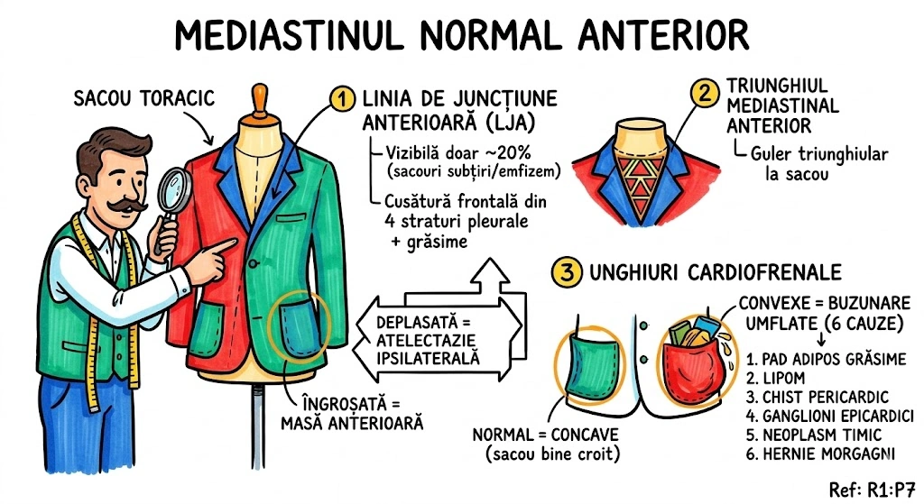 Traficul in intersectia mediastinala. Fiecare vehicul parcat (organ mediastinal) isi pierde conturul cand un alt vehicul (consolidare) se lipeste de el bumper-to-bumper. In intersectia toracica din fata (PA): vehiculul VCS (mediastin superior drept) — cand LSD se lipeste, conturul superior drept dispare. Vehiculul Cord Drept — cand LMD se lipeste, marginea cardiaca dreapta dispare. Vehiculul Hemidiafragm Drept — cand LID se lipeste, cupola dreapta devine invizibila. Vehiculul Arc Aortic — cand LSS se lipeste, mediastinul superior stang dispare. Vehiculul Cord Stang — cand segmentele lingulare se lipesc, marginea cardiaca stanga dispare. Vehiculul Hemidiafragm Stang — cand LIS se lipeste, cupola stanga dispare.