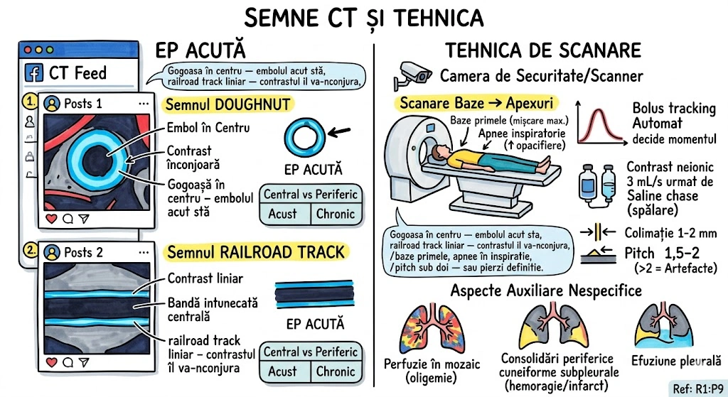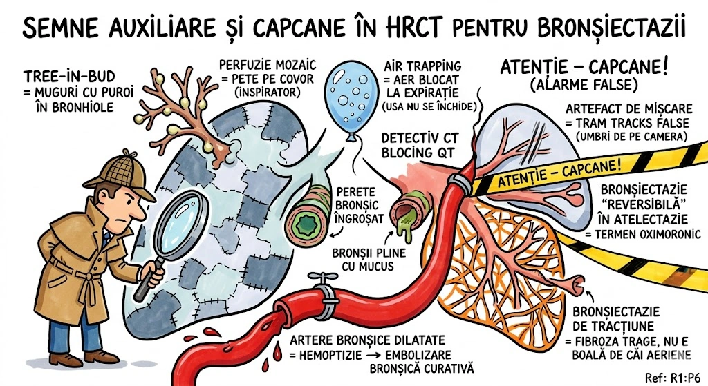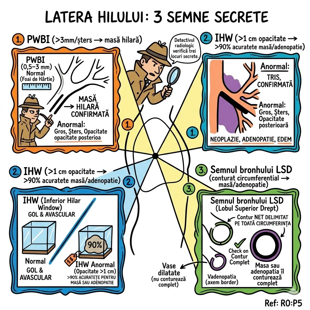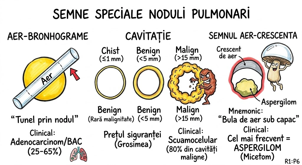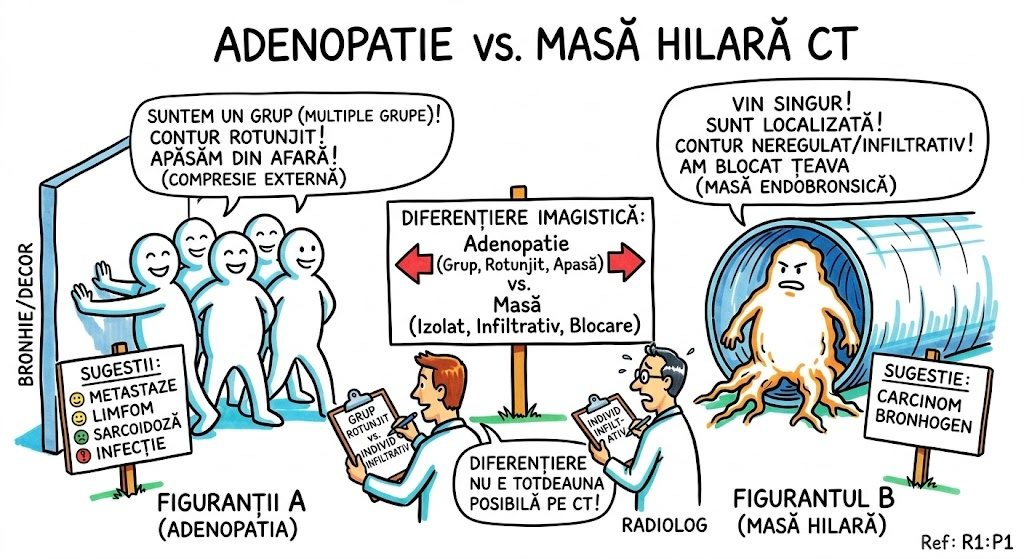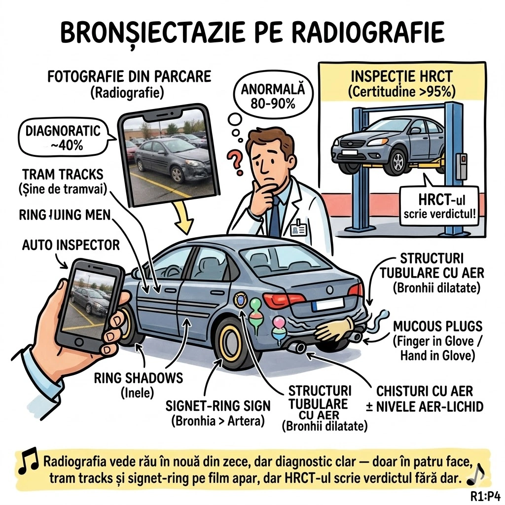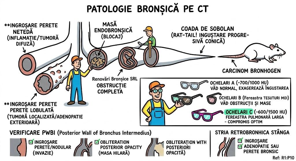🥊 Ringul Comparatiilor: Bronhograma aeriana prezenta vs. absenta e diferenta intre un pod deschis peste o apa tulbure si un pod inundat sub apa — in ambele cazuri apa e problema, dar traficul pe pod e diferit. Prezenta: bronhiile sunt permeabile, aerul trece, dar parenchimul e plin de altceva. Absenta: bronhia insasi e blocata (tumora, mucus) sau umpluta de procesul patologic (infarct cu bronhii pline de sange).