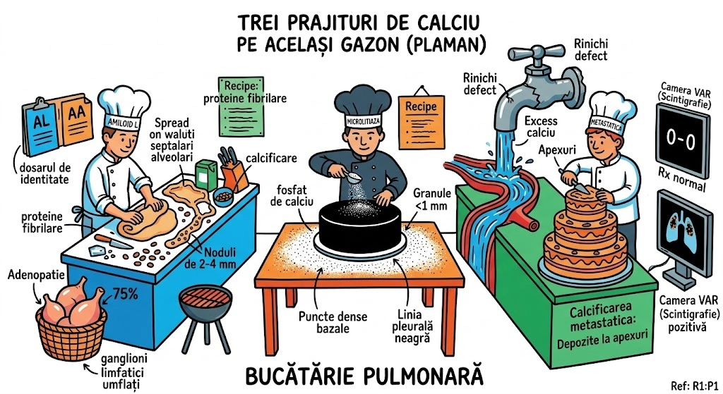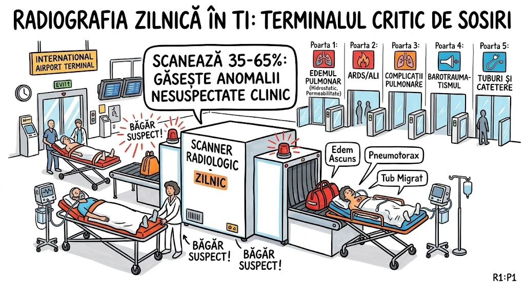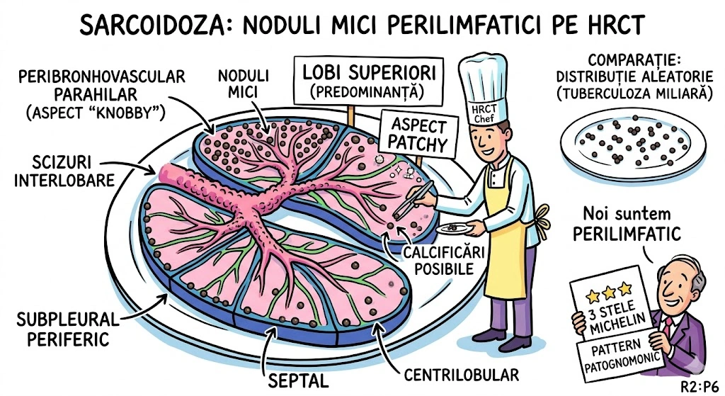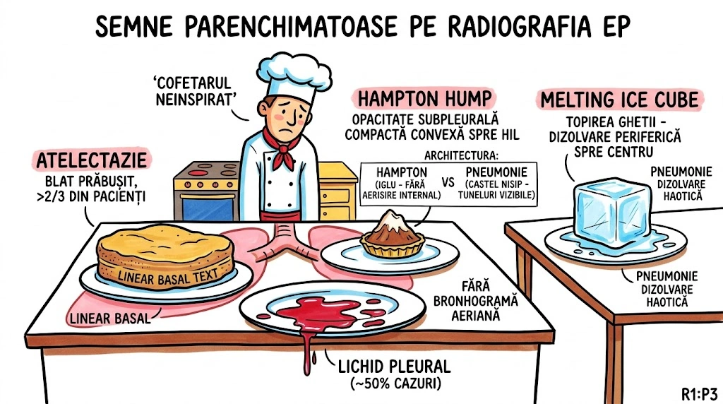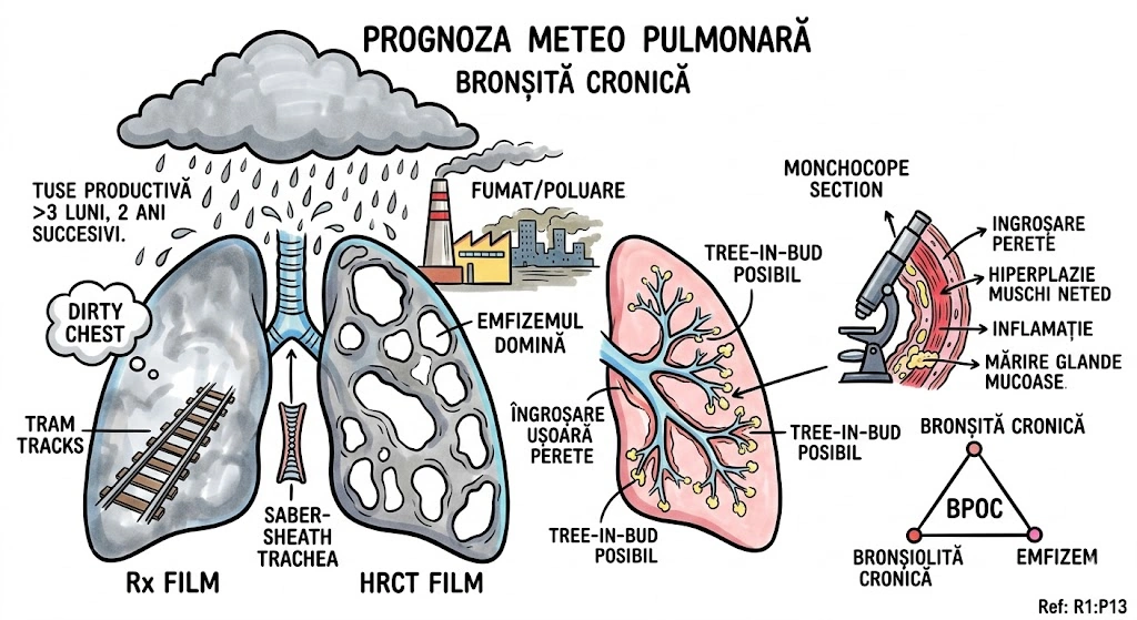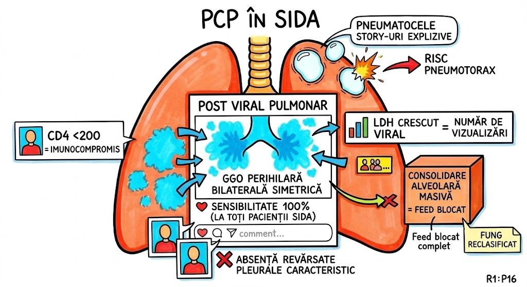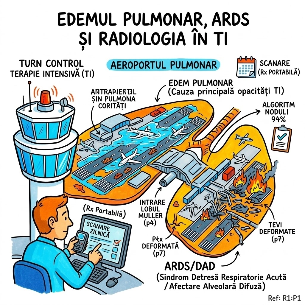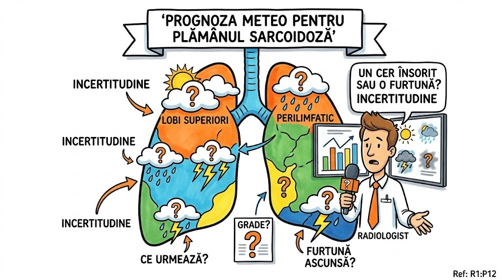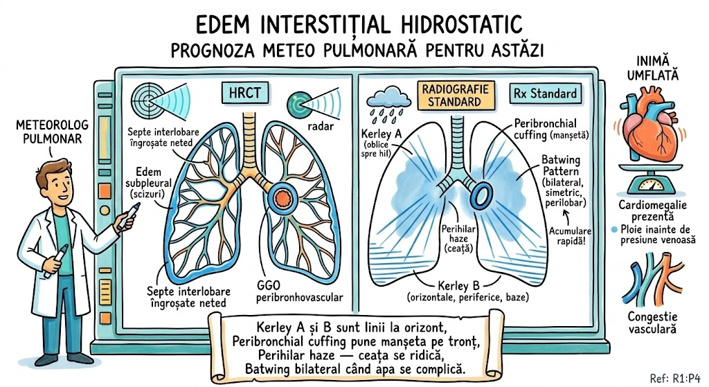 Meteorologul pulmonar prezinta prognoza zilei: „In zona centrala perihilara — furtuna bat-wing cu probabilitate 90% de edem pulmonar. Aripile de liliac se extind bilateral." „La periferie — inghet cronic: eozinofilica clasica, BOOP-ul si sarcoidoza formeaza cristale pe marginile plamanilor." „Precipitatii in pete, neregulate — orice pneumonie poate fi vinovata, plus SDRA si aspiratia." „Grindina nodulara difuza — TBC-ul si CMV-ul imprastie noduli aerospatiali prin arborele bronsic." „Ceata totala omogena — edem masiv, hemoragie sau SDRA. Vizibilitate pulmonara zero." Regula meteo de aur: bat-wing = gandul numarul 1 e edemul; periferic = gandul numarul 1 e boala cronica.