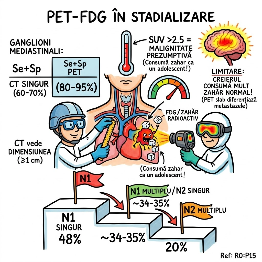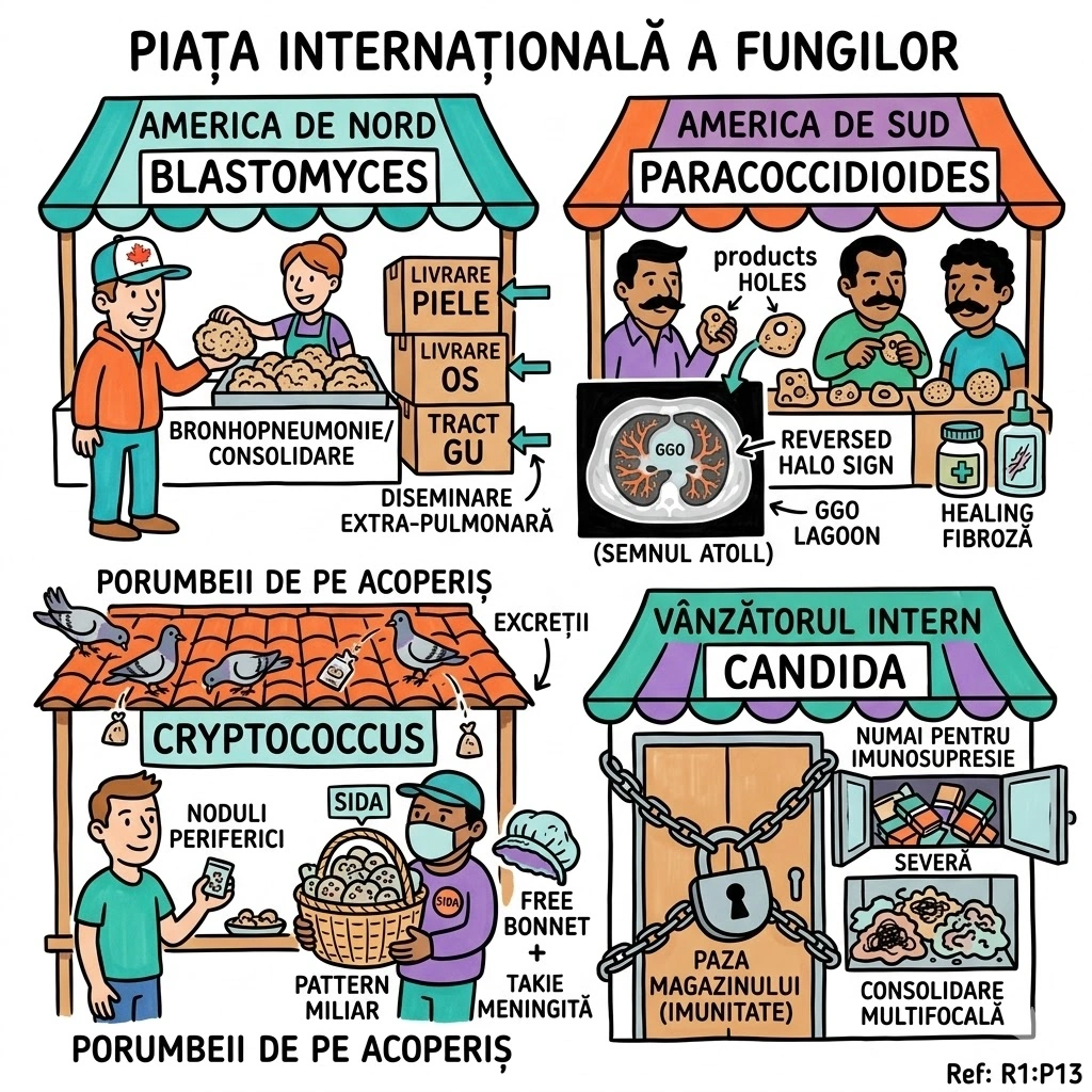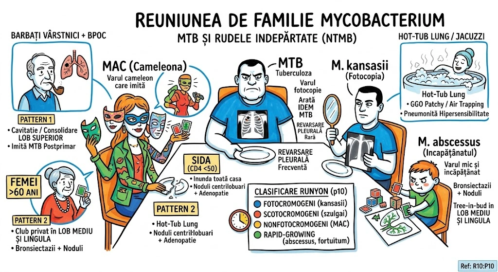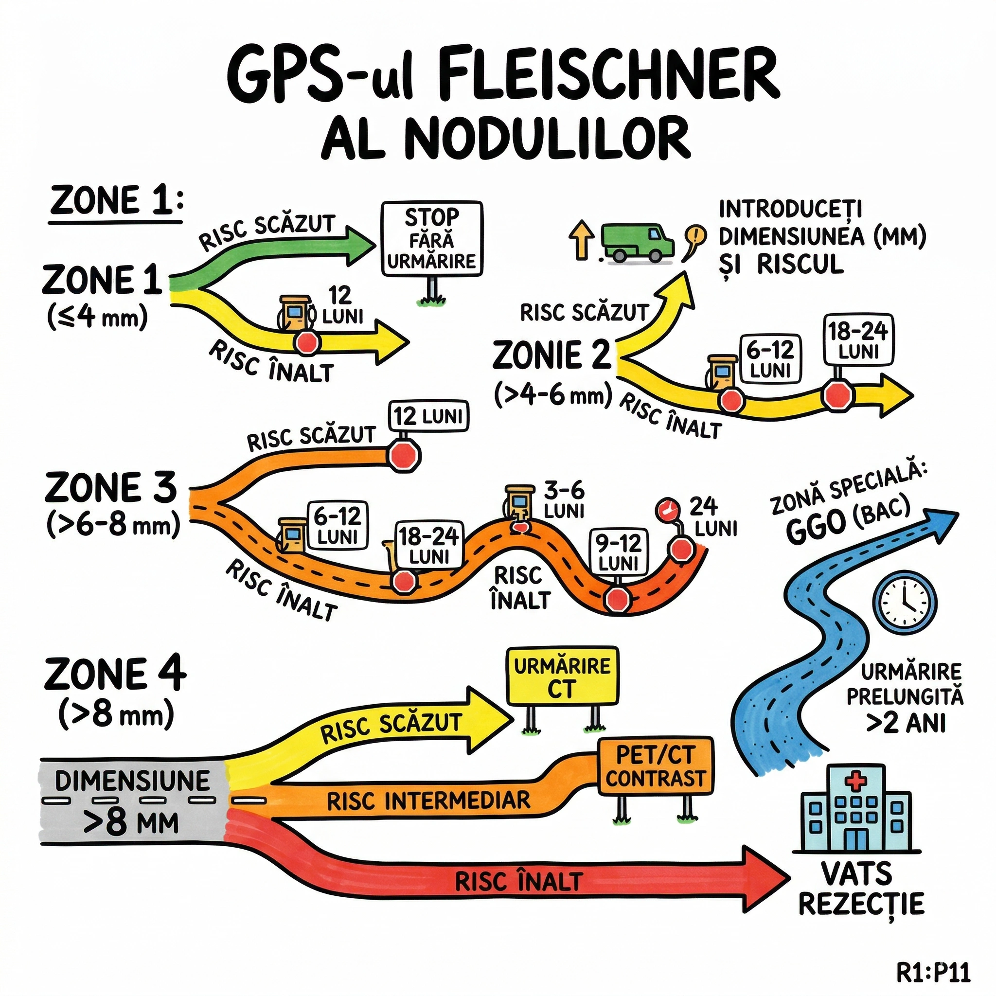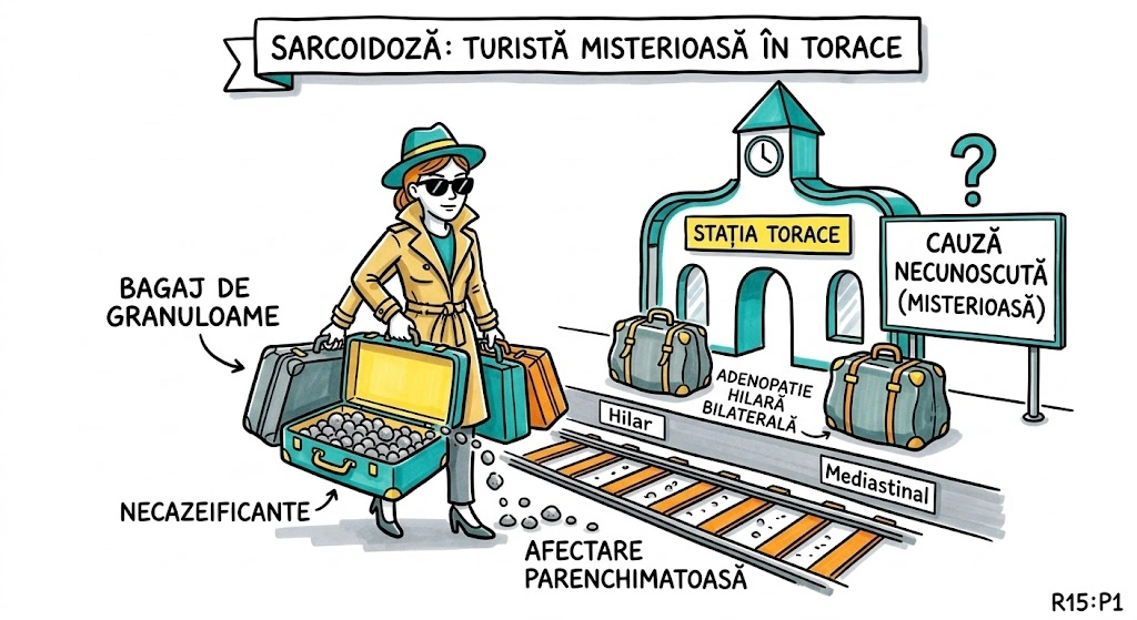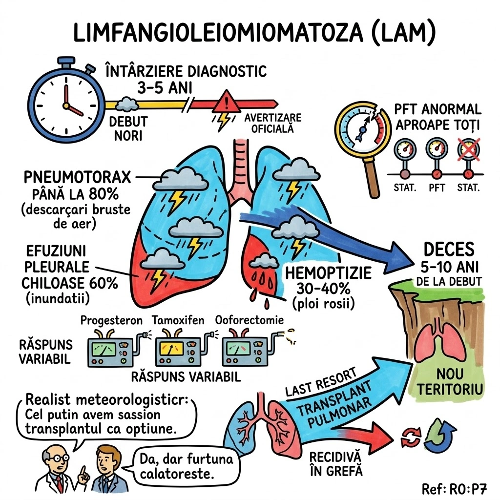 Meteorologul pulmonar prezinta prognoza zilei: „In zona centrala perihilara — furtuna bat-wing cu probabilitate 90% de edem pulmonar. Aripile de liliac se extind bilateral." „La periferie — inghet cronic: eozinofilica clasica, BOOP-ul si sarcoidoza formeaza cristale pe marginile plamanilor." „Precipitatii in pete, neregulate — orice pneumonie poate fi vinovata, plus SDRA si aspiratia." „Grindina nodulara difuza — TBC-ul si CMV-ul imprastie noduli aerospatiali prin arborele bronsic." „Ceata totala omogena — edem masiv, hemoragie sau SDRA. Vizibilitate pulmonara zero." Regula meteo de aur: bat-wing = gandul numarul 1 e edemul; periferic = gandul numarul 1 e boala cronica.