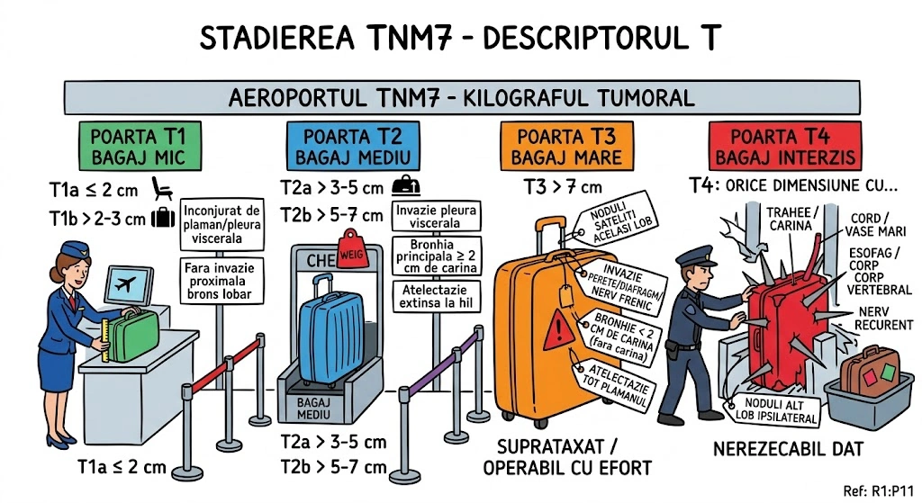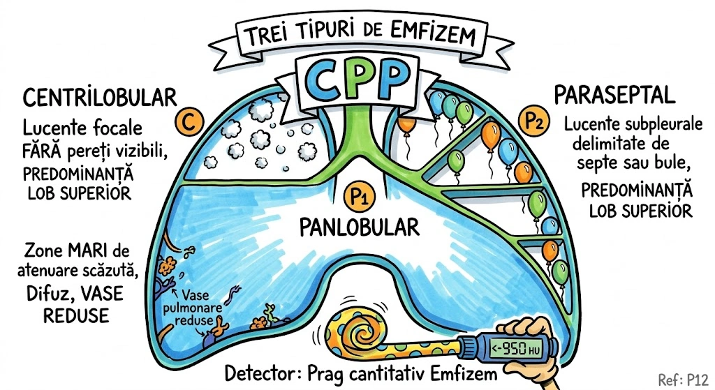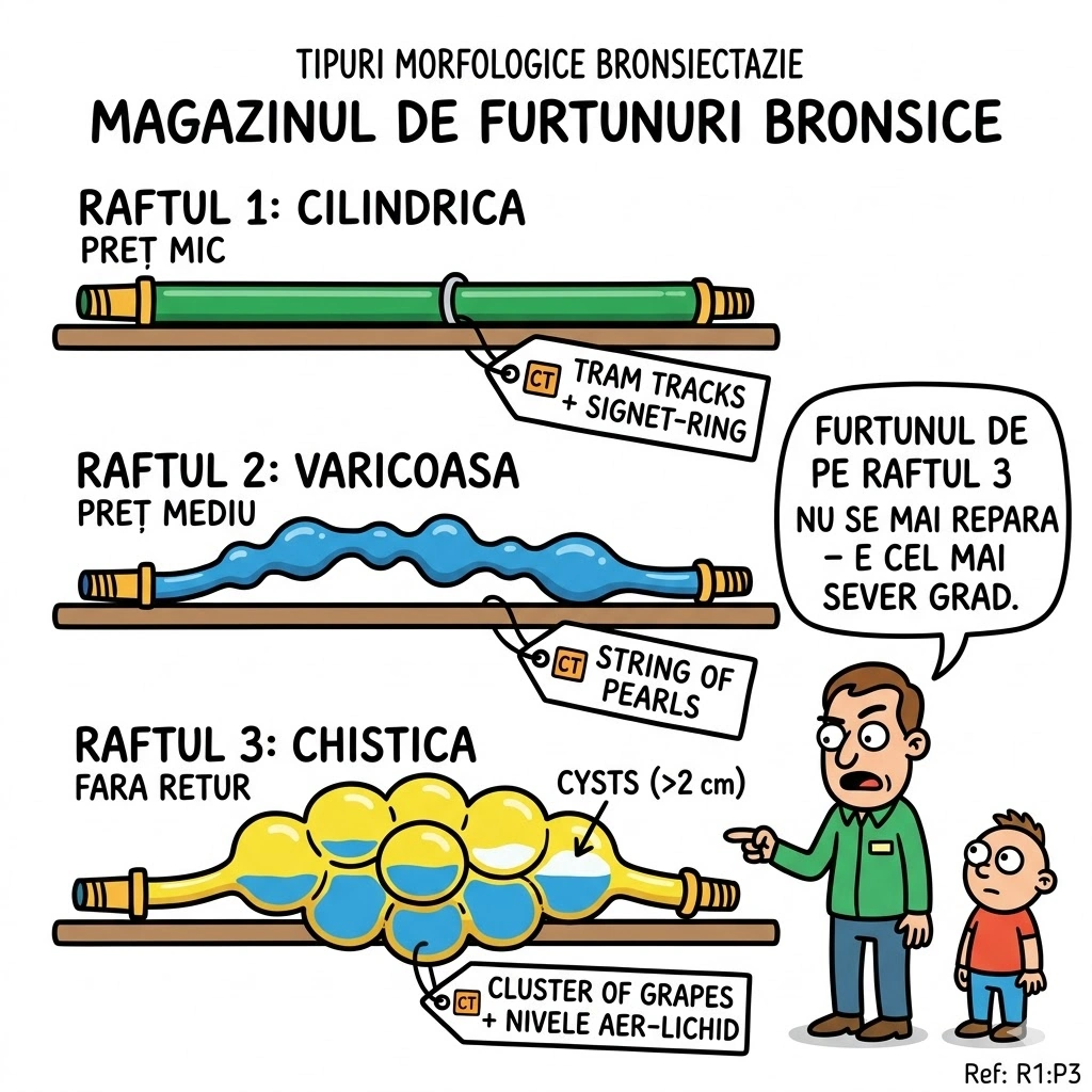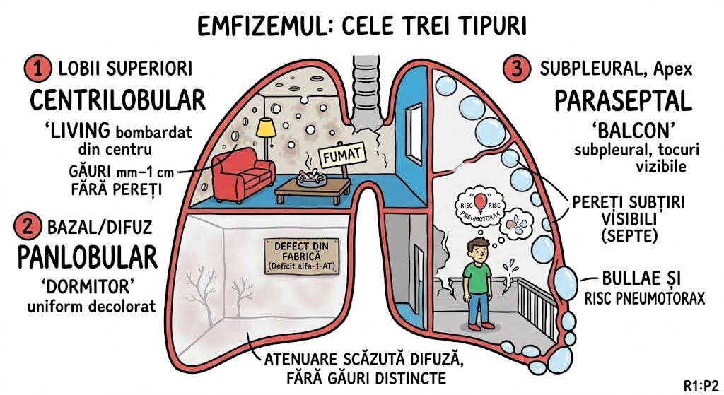 Un bloc de apartamente construit gresit din fabrica, cu cinci tipuri de defecte arhitecturale. Etajul 1 (Tip 1 — 65% din blocuri): apartamente mari, spatioase (chisturi >2 cm), cu geamuri mari (chisturi aerate, vizibile pe CT ca mase multichistice). Locatarii traiesc confortabil — prognostic bun. Etajul 2 (Tip 2 — 20-25%): garsoniere mici si inghesuie (chisturi <2 cm). Locatarii au si alte probleme: rinichi defecti, inima cu defecte — prognostic rezervat. Subsolul (Tip 3 — 10%): spatii microscopice, practic invizibile (<3-5 mm). Pe CT arata ca o masa solida. Prognostic rezervat. Mansarda si terasa (Tipuri 0 si 4): rare, aspecte variabile. Intregul bloc comunica cu sistemul de ventilatie (arborele bronsic) si e alimentat de conducta principala (artera pulmonara). La 70% din blocuri, defectele se vad in prima saptamana de la constructie (nastere). Solutia radicala: demolarea etajului defect (excizie lobara).