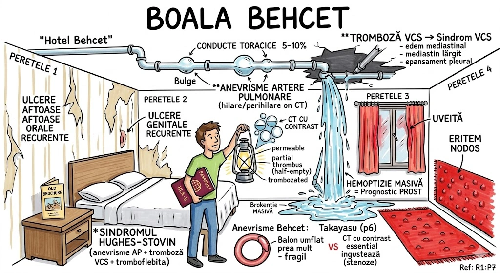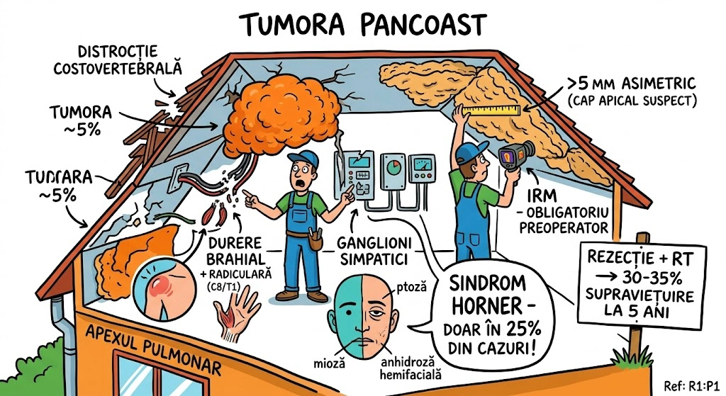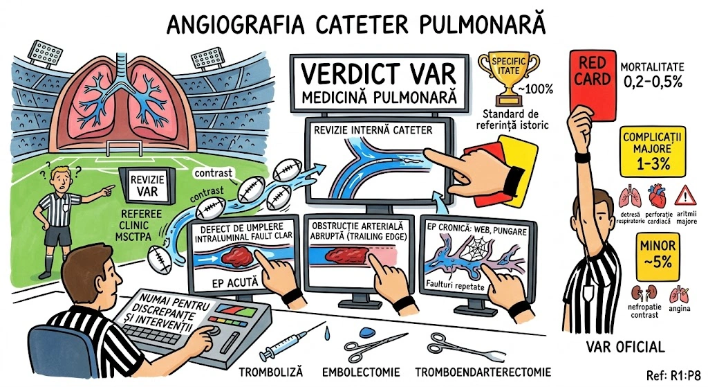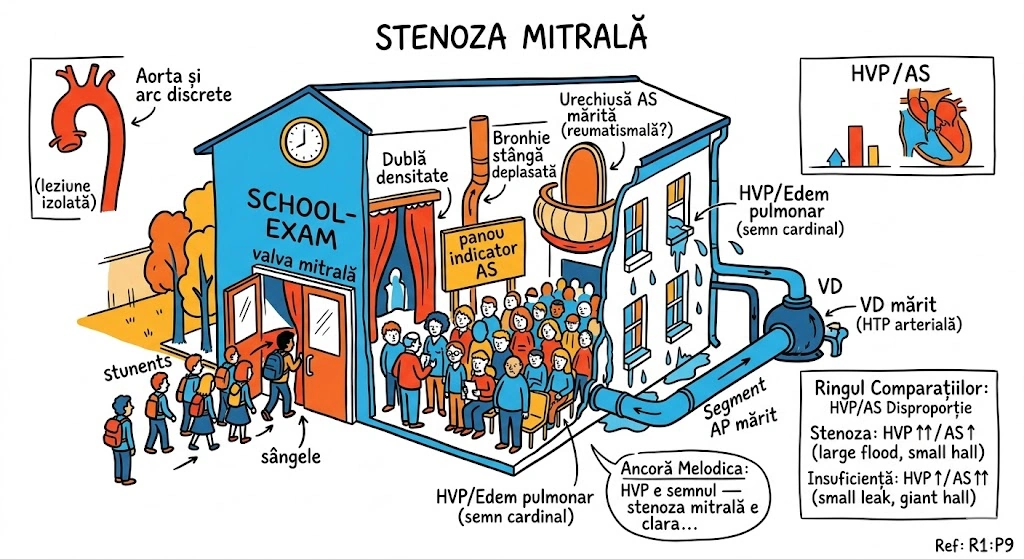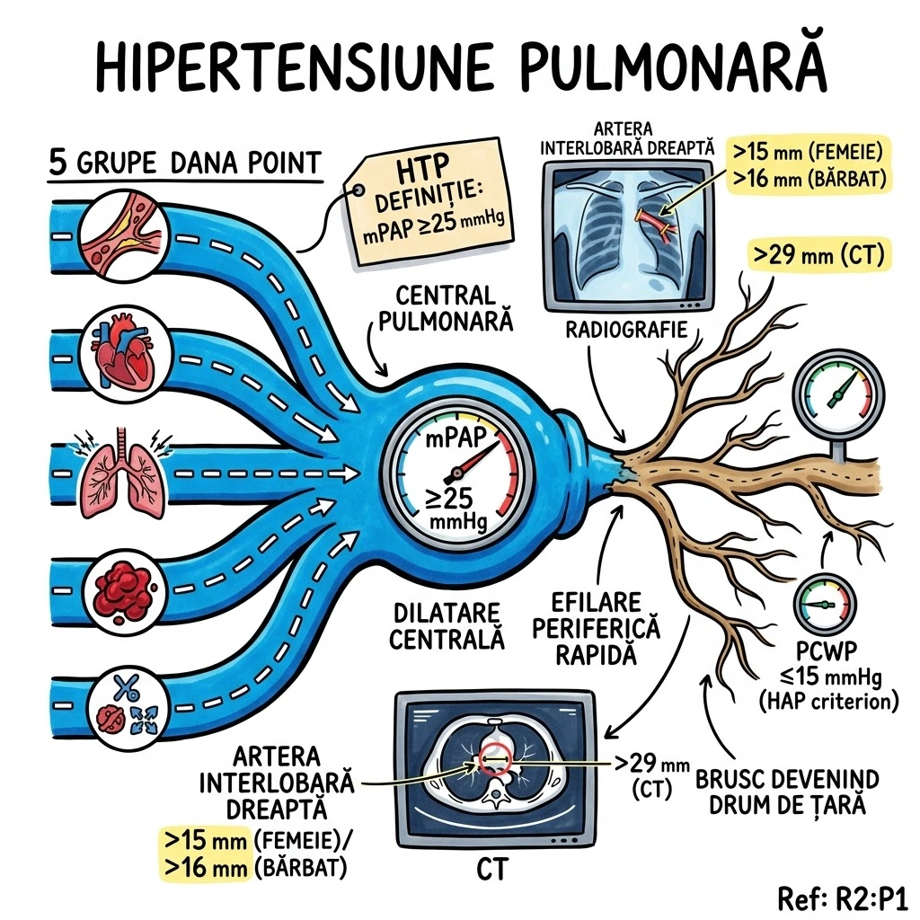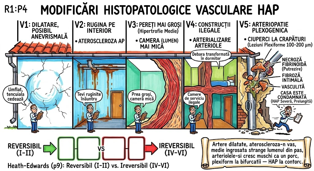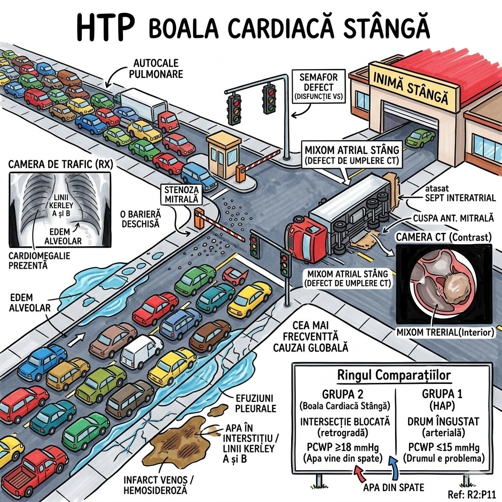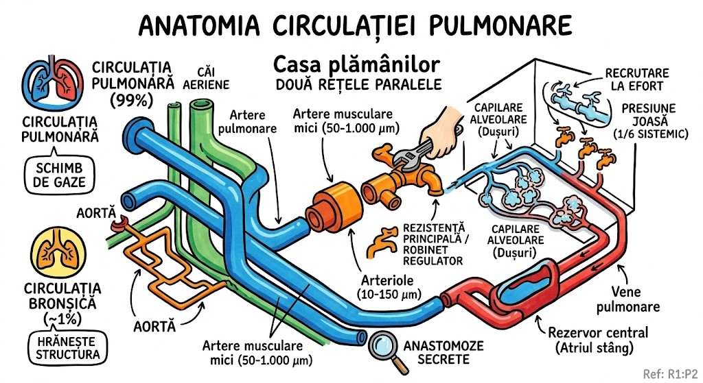 🥊 Ringul Comparatiilor: MAV pulmonara e ca o scurtatura de instalatie facuta in graba — apa ocoleste caloriverele si ajunge direct la canalizare. Diferenta fata de sechestrul bronhopulmonar (p12): sechestrul primeste apa de la alta sursa (artera sistemica din aorta), MAV primeste apa din conducta corecta (artera pulmonara) dar o trimite direct la iesire fara sa treaca prin calorifer (capilare). Ambele sunt defecte vasculare, dar cu circuite complet diferite.