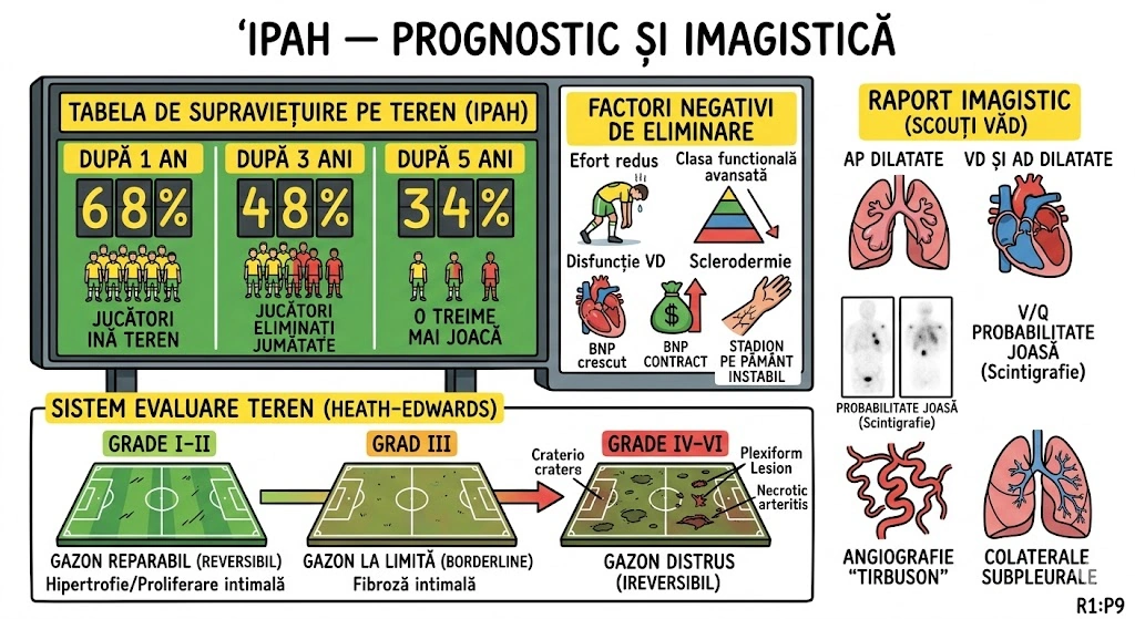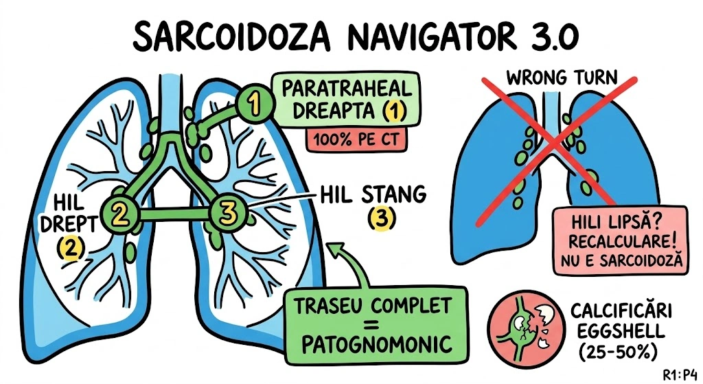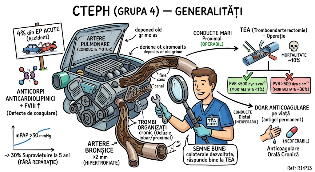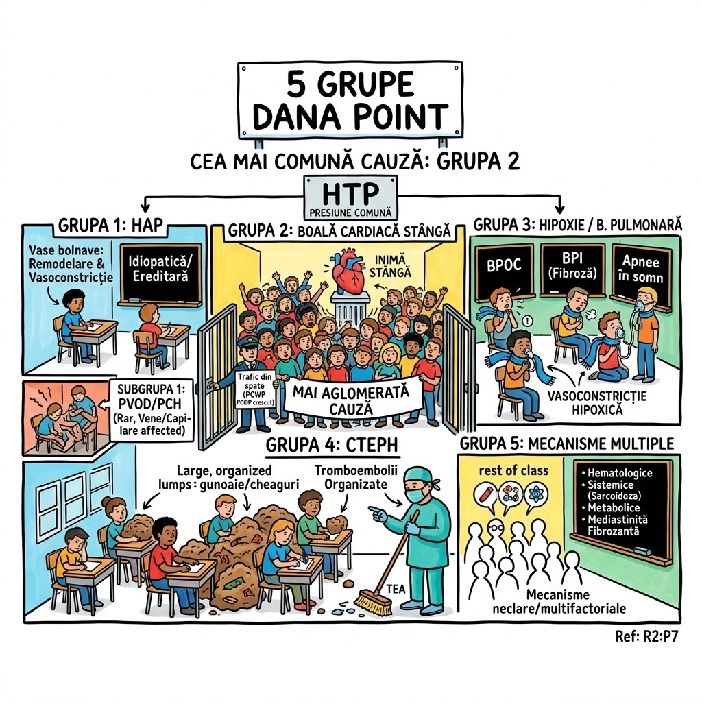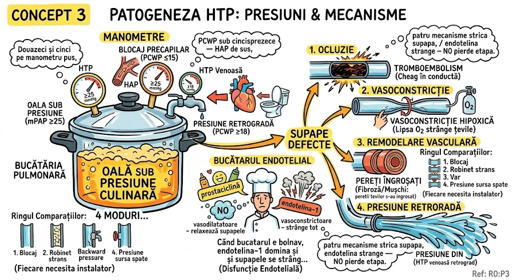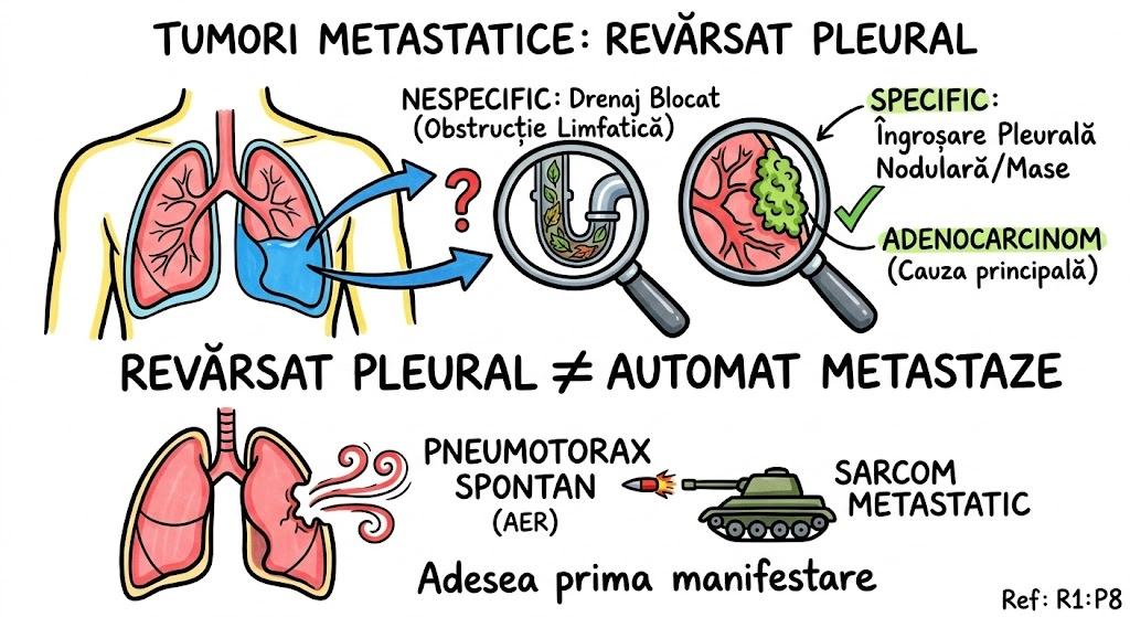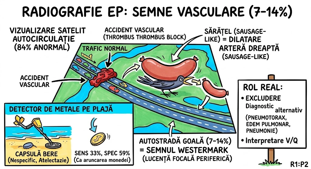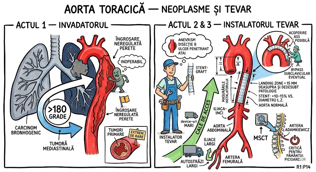 🥊 Ringul Comparatiilor: MAV pulmonara e ca o scurtatura de instalatie facuta in graba — apa ocoleste caloriverele si ajunge direct la canalizare. Diferenta fata de sechestrul bronhopulmonar (p12): sechestrul primeste apa de la alta sursa (artera sistemica din aorta), MAV primeste apa din conducta corecta (artera pulmonara) dar o trimite direct la iesire fara sa treaca prin calorifer (capilare). Ambele sunt defecte vasculare, dar cu circuite complet diferite.