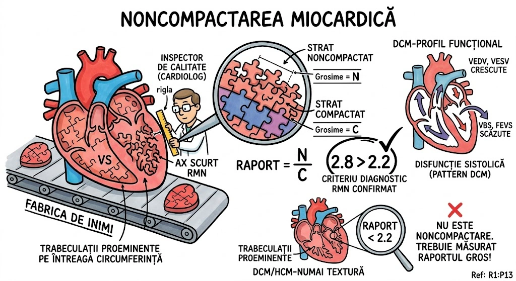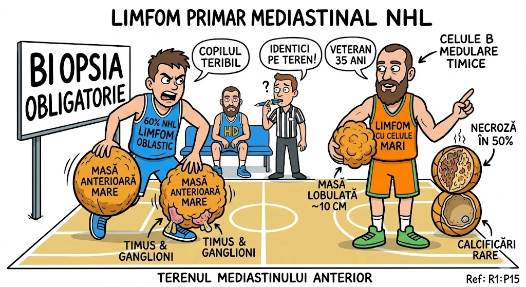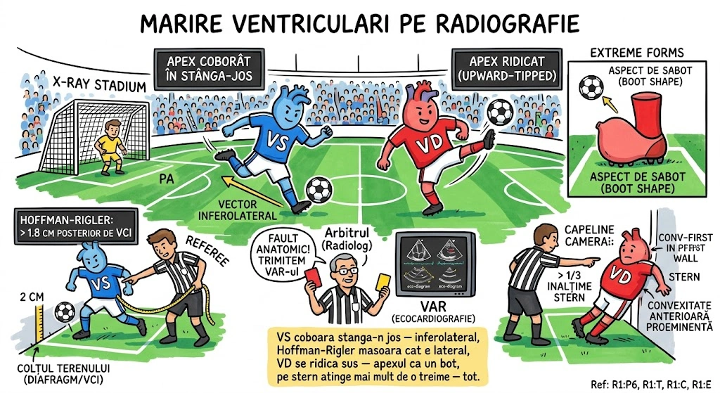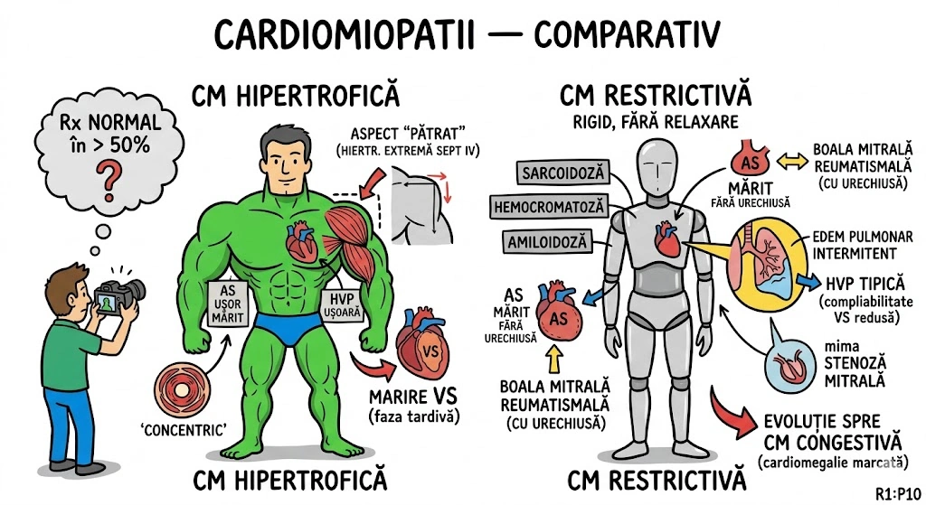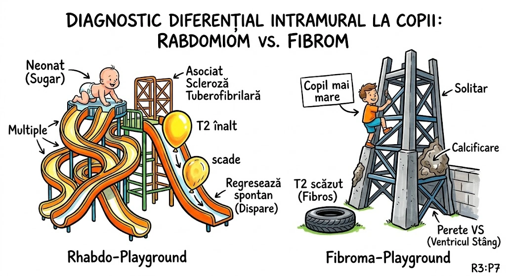 🥊 Ringul Comparatiilor: Rabdomiomul vs. fibromul la copii e ca doua echipe de fotbal din curtea scolii: echipa in alb (rabdomiom — T2 inalt, multiplu, asociat scleroaza tuberoasa) vs. jucatorul singuratic in negru (fibromul — T2 scazut, solitar, calcificari). Ambii joaca pe acelasi teren (miocardul pediatric). Dar niciodata nu le confunzi daca le stii culorile tricourilor si numarul de jucatori.