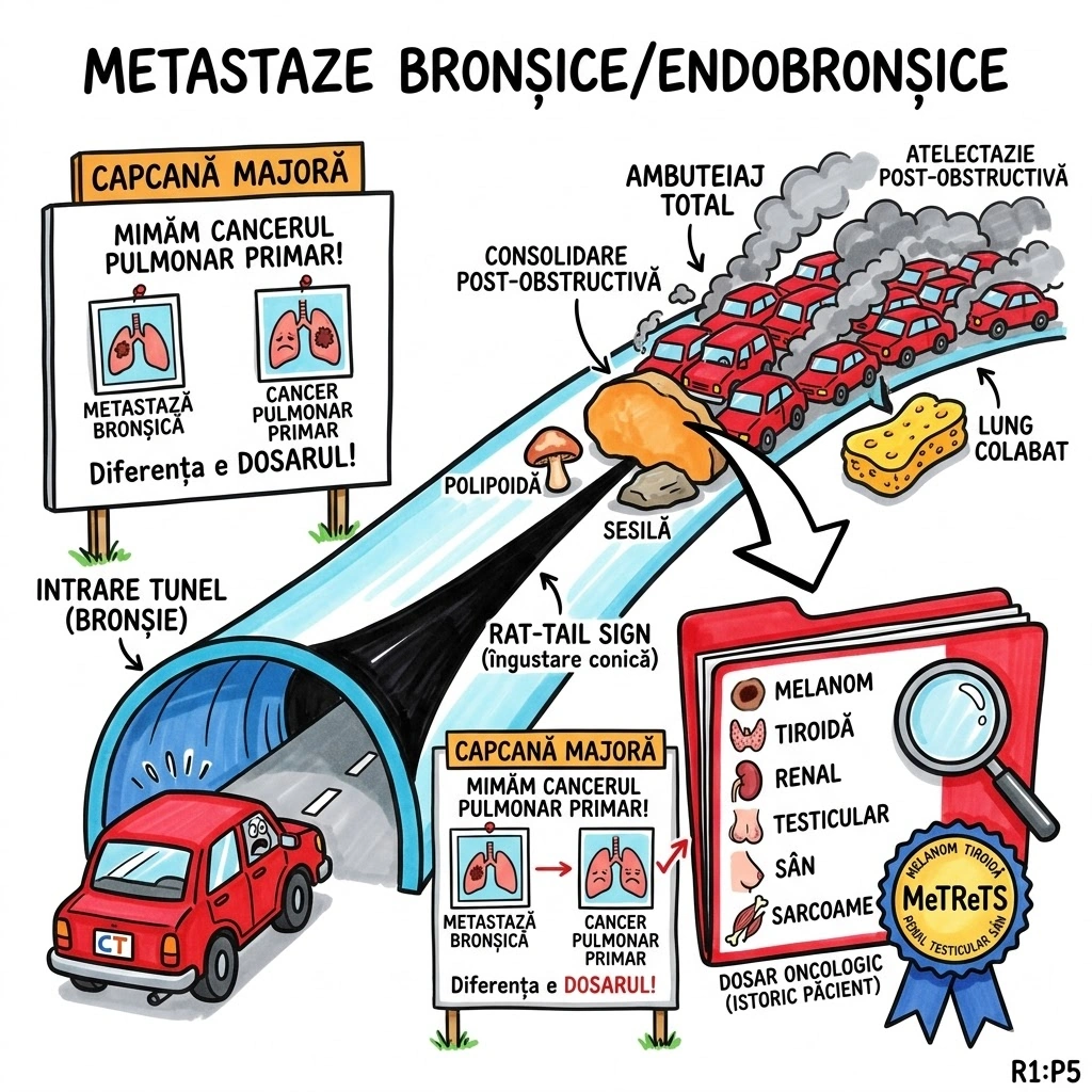 Autostrada Bronsica, km 0 al Lobului Superior Stang: bariera de constructii pusa in gestatie, niciodata ridicata. In spatele ei — gunoiul s-a acumulat in forma tubulara, ramificata sau ovoida (dop mucos — aspect CT cu atenuare redusa). De cealalta parte a barierei, drumul e pustiu si stralucitor (hiperlucenta distala) — nicio masina (hipovascularizatie), dar aerul vine pe drumuri de camp (ventilatie colaterala). Zona izolata s-a umflat atat de mult (air trapping) incat a impins gardul median al autostrazii (deviere mediastinala). Un inspector rutier gaseste bariera la 35 de ani — descoperire incidentala. Prima intrebare: "E santier abandonat sau cineva a pus bariera cu un motiv?" Bronhoscopia exclude tumoare obstructiva.