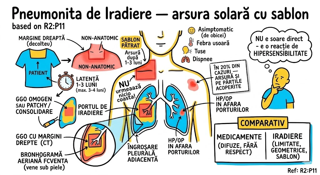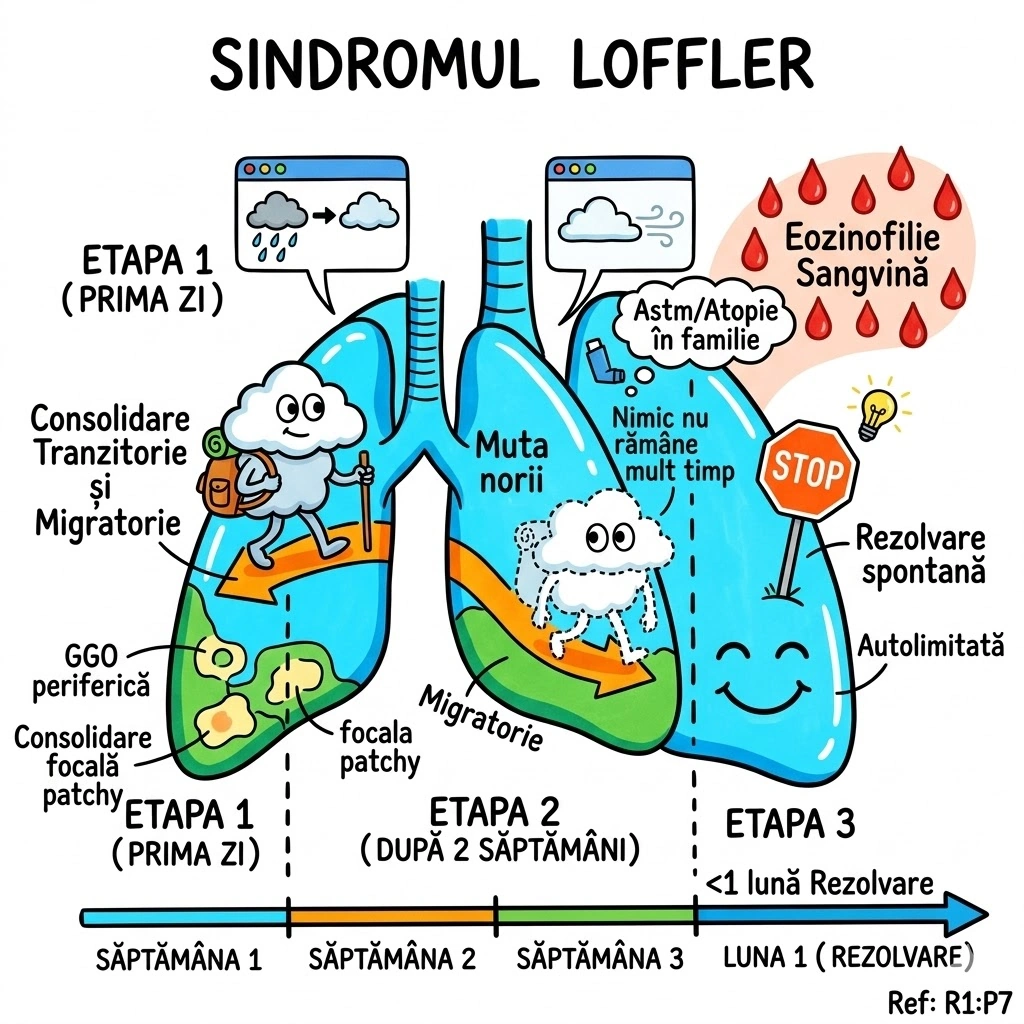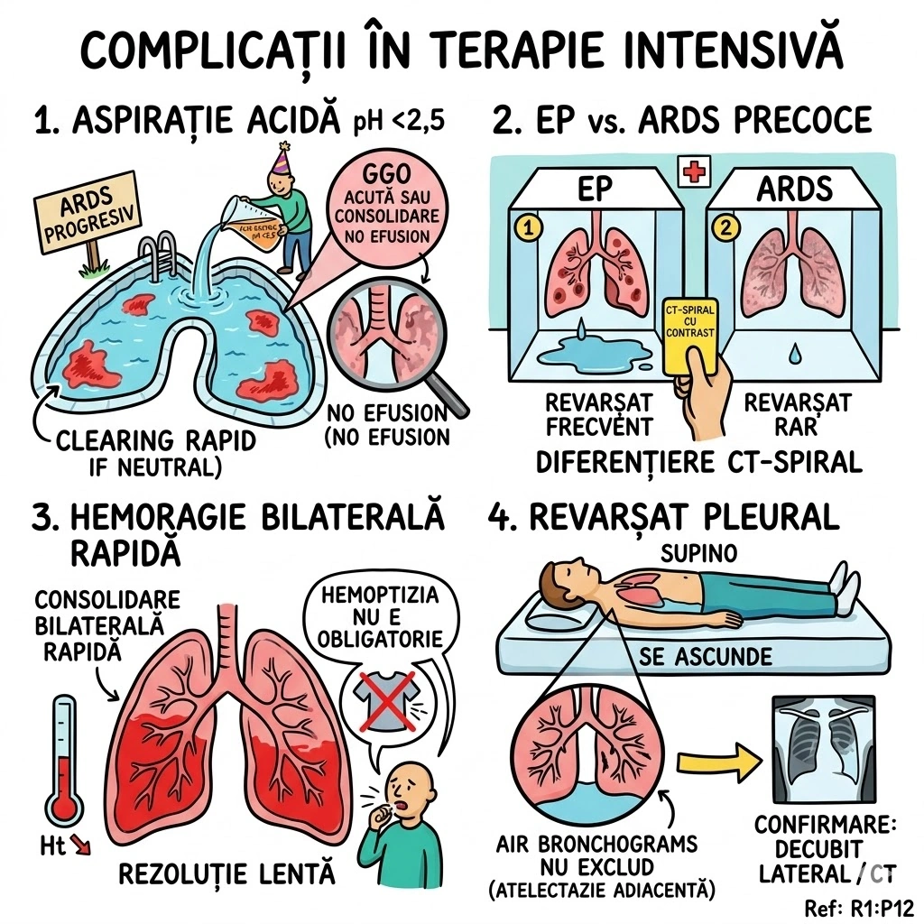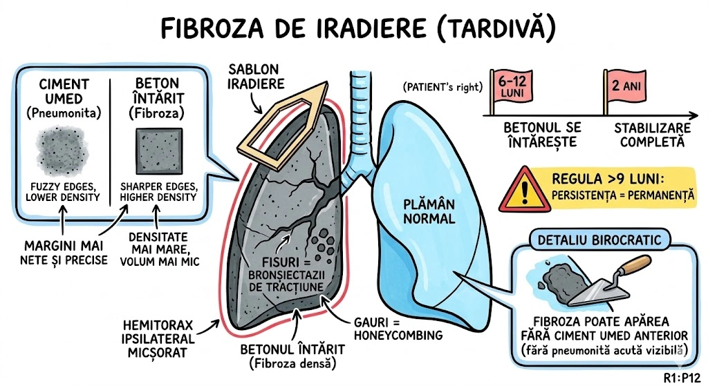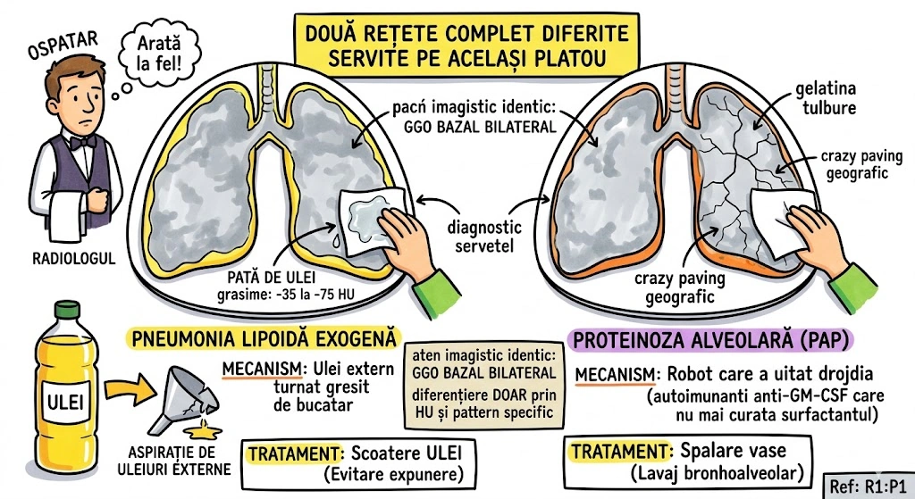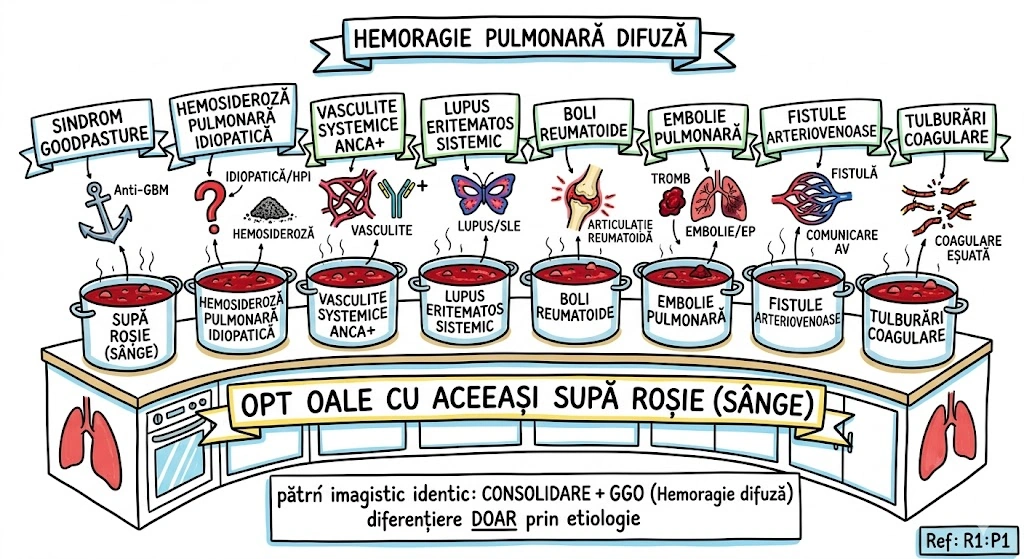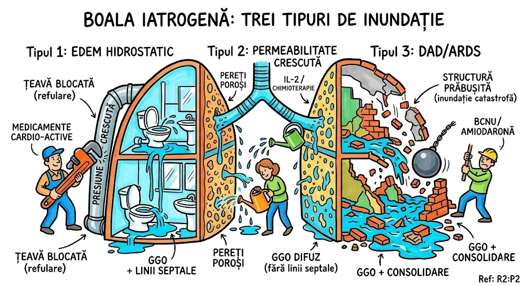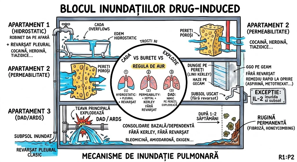 🥊 Ringul Comparatiilor: Consolidarea rapid aparuta (ore) vs. persistent cronica (4–6 saptamani) e diferenta intre un accident de masina si o rugina progresiva. Accidentul (edem, aspiratie, hemoragie) e brusc, dramatic, vizibil imediat. Rugina (eozinofilica, BOOP, carcinom) e lenta, insidioasa, descoperita intamplator. Ambele distrug masina, dar cronometrul iti spune cine e vinovatul.