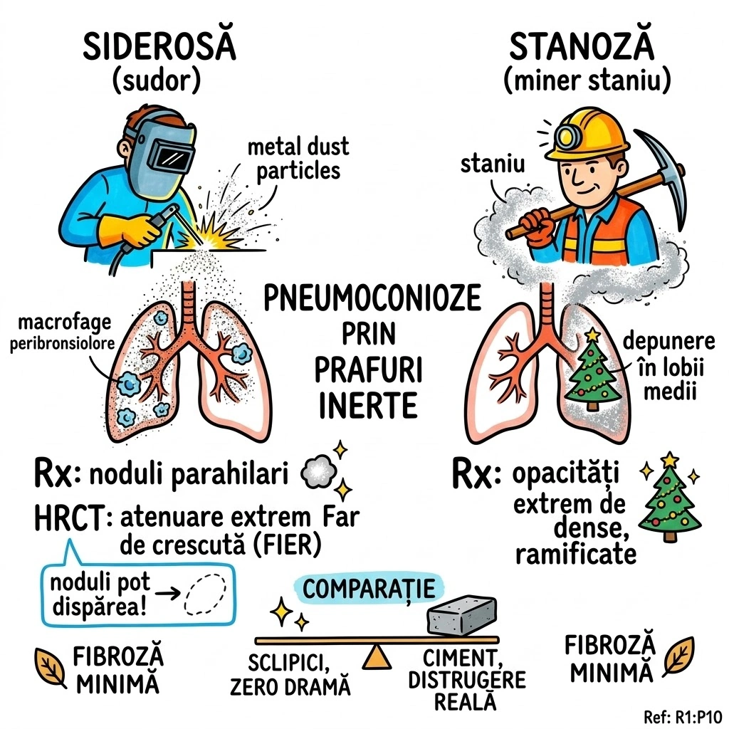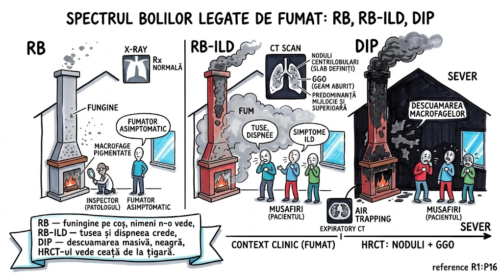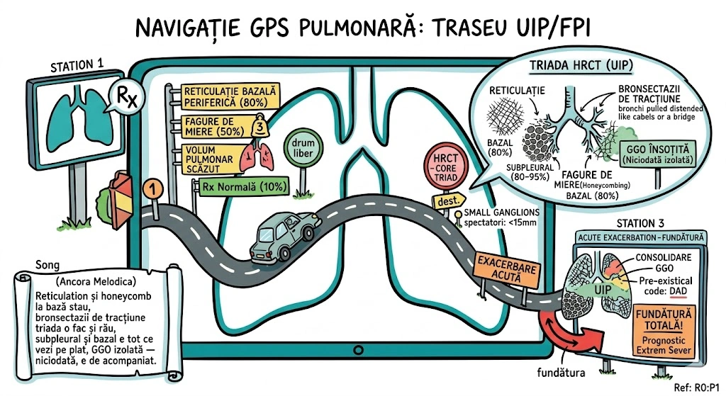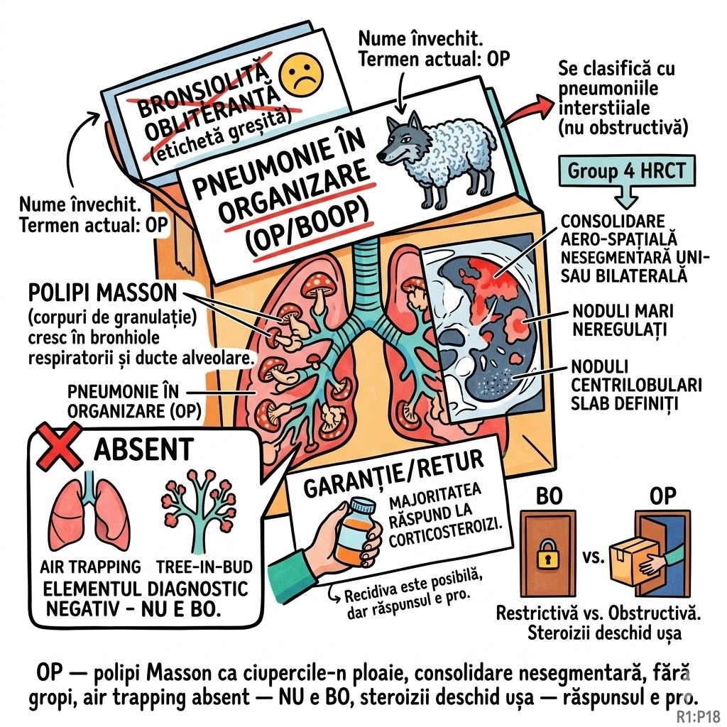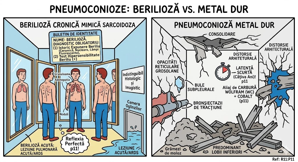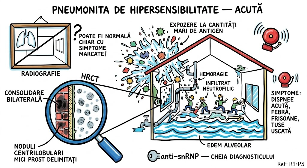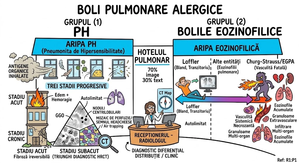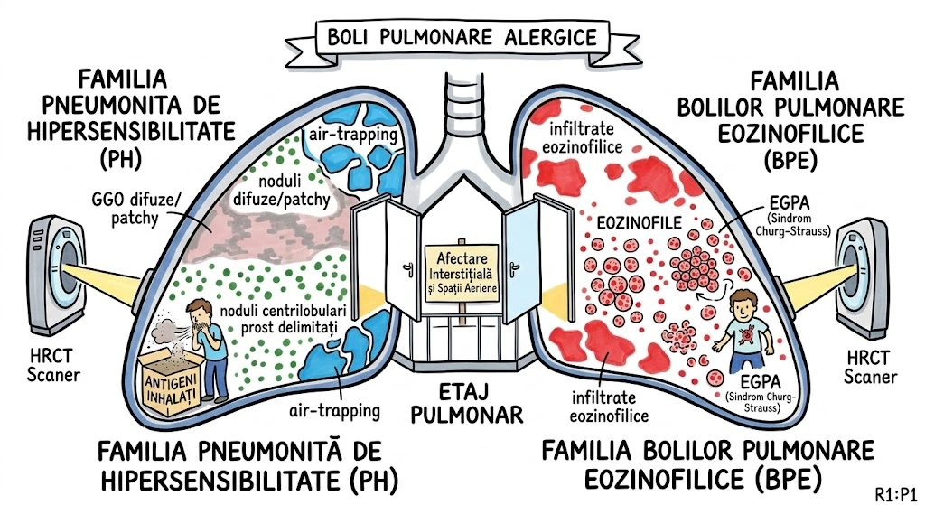🥊 Ringul Comparatiilor: Consolidarea rapid aparuta (ore) vs. persistent cronica (4–6 saptamani) e diferenta intre un accident de masina si o rugina progresiva. Accidentul (edem, aspiratie, hemoragie) e brusc, dramatic, vizibil imediat. Rugina (eozinofilica, BOOP, carcinom) e lenta, insidioasa, descoperita intamplator. Ambele distrug masina, dar cronometrul iti spune cine e vinovatul.
