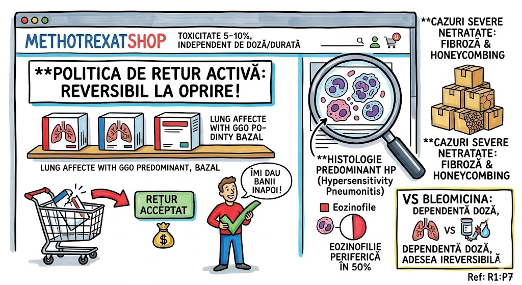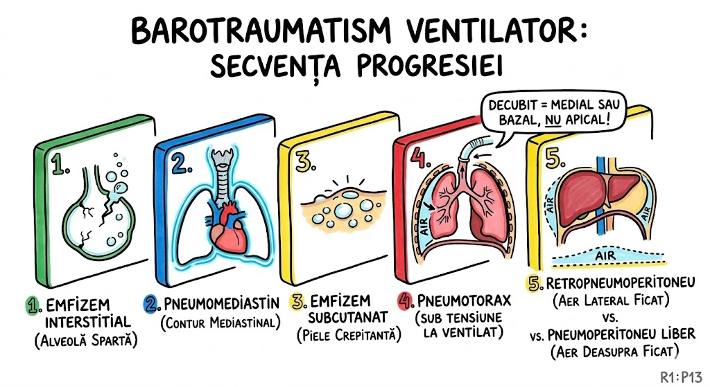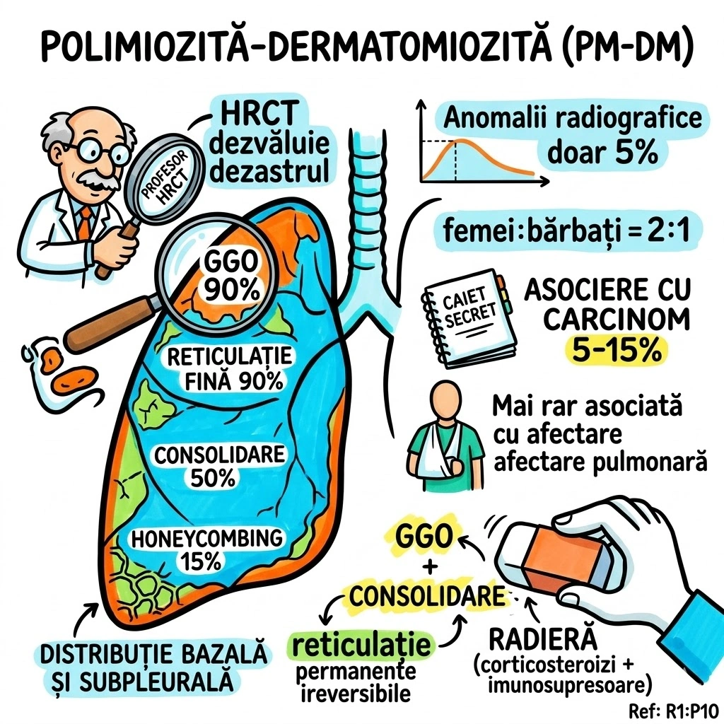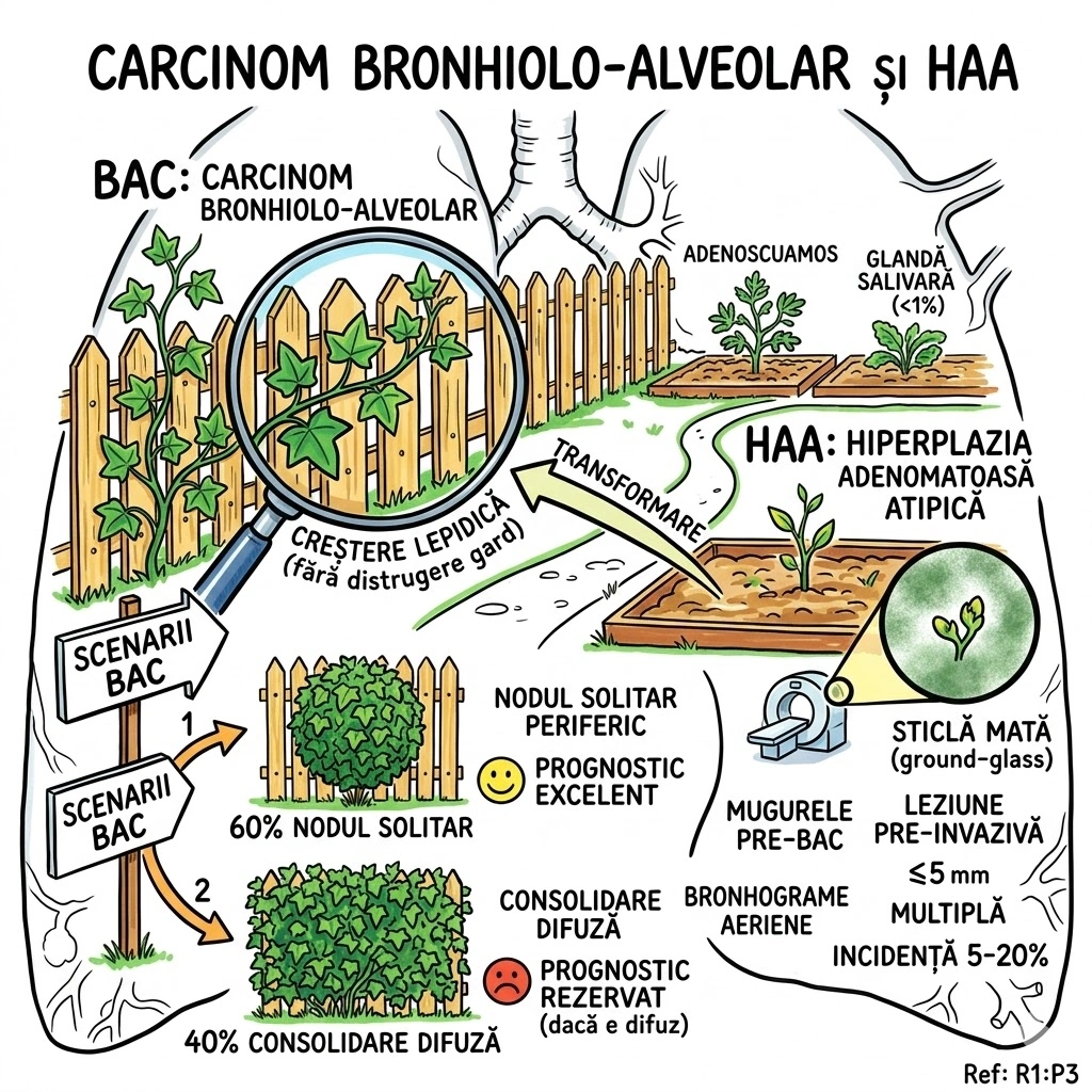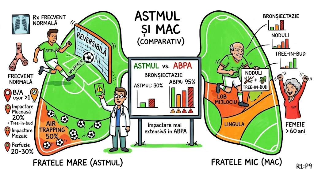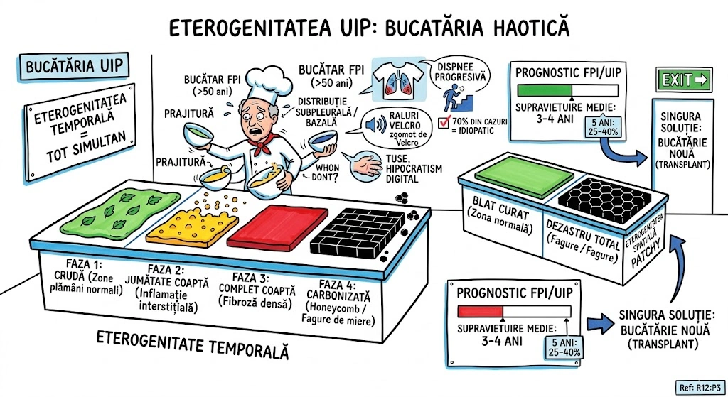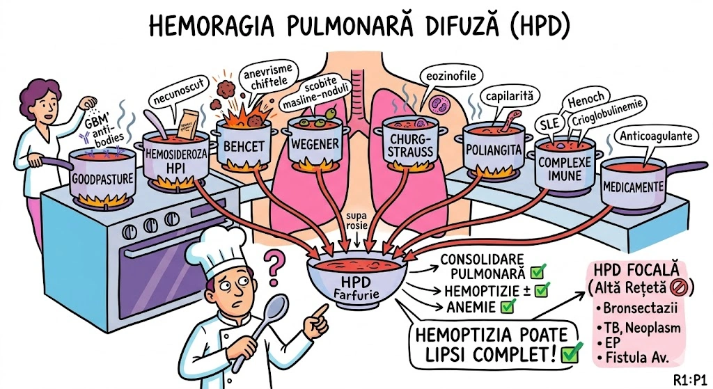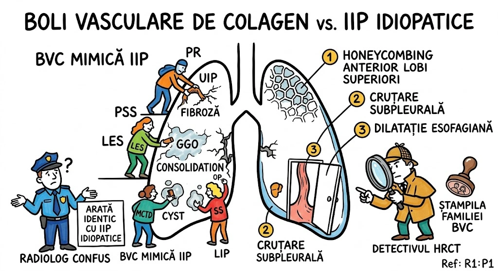 🥊 Ringul Comparatiilor: Consolidarea rapid aparuta (ore) vs. persistent cronica (4–6 saptamani) e diferenta intre un accident de masina si o rugina progresiva. Accidentul (edem, aspiratie, hemoragie) e brusc, dramatic, vizibil imediat. Rugina (eozinofilica, BOOP, carcinom) e lenta, insidioasa, descoperita intamplator. Ambele distrug masina, dar cronometrul iti spune cine e vinovatul.