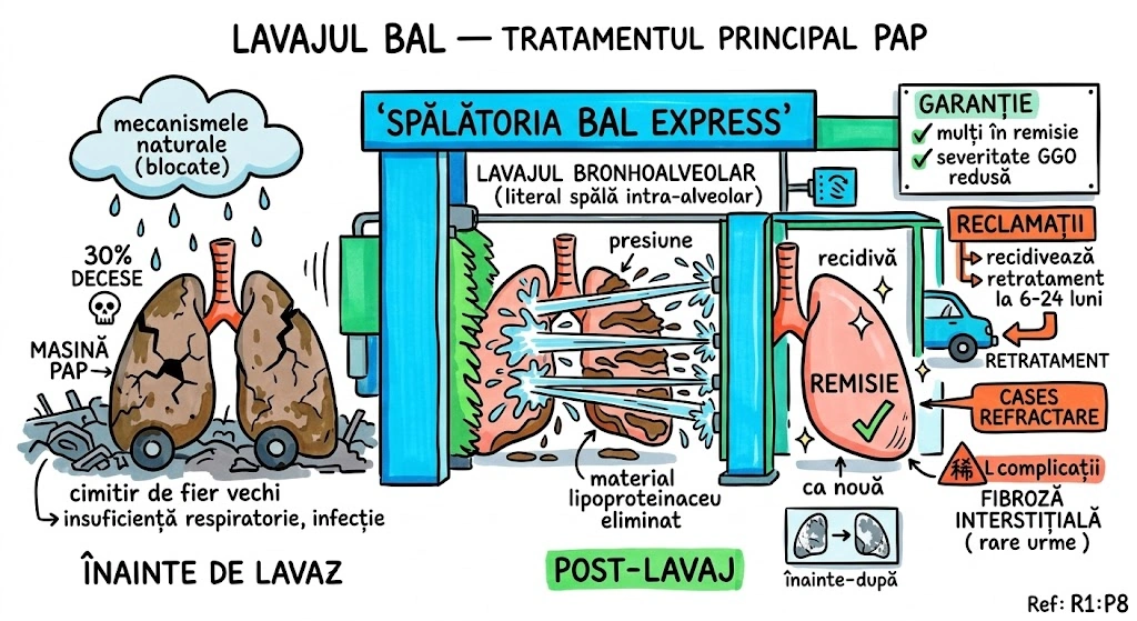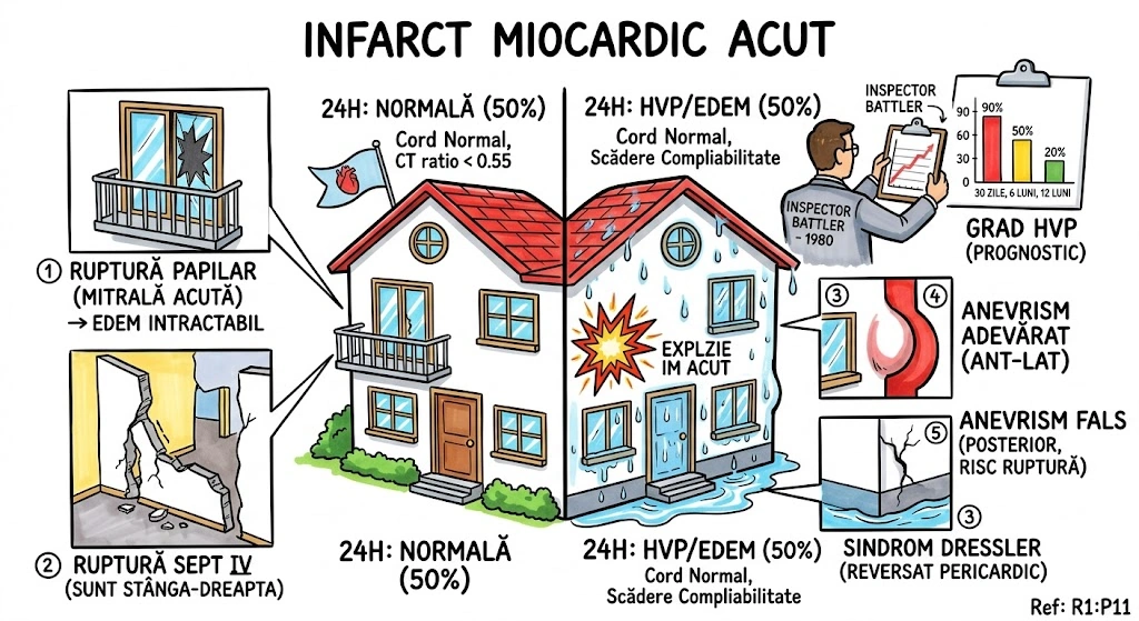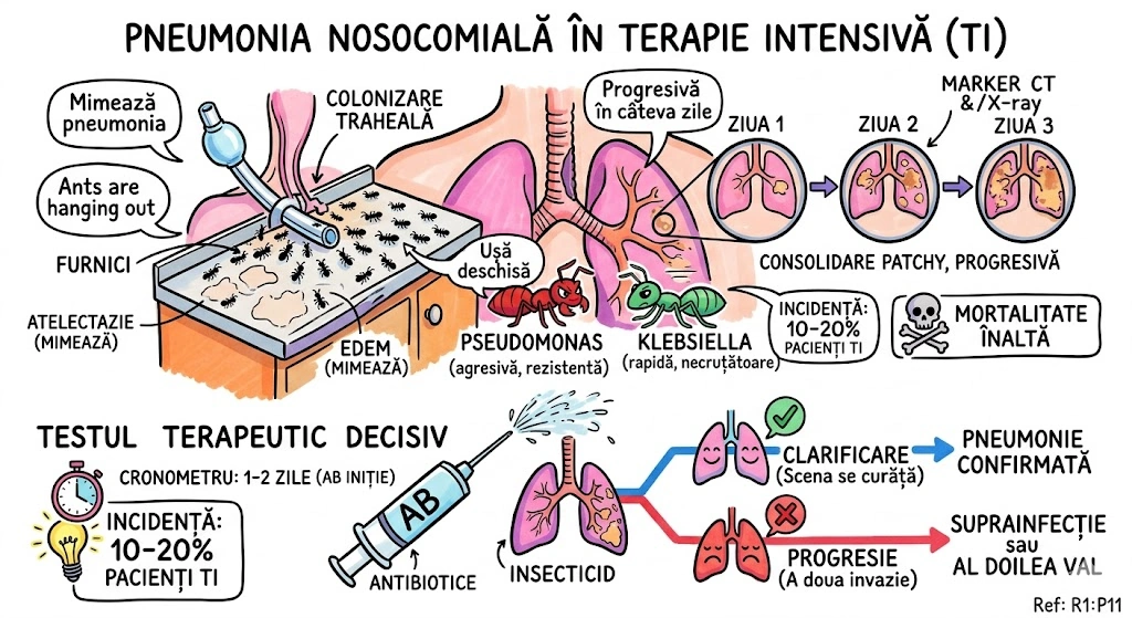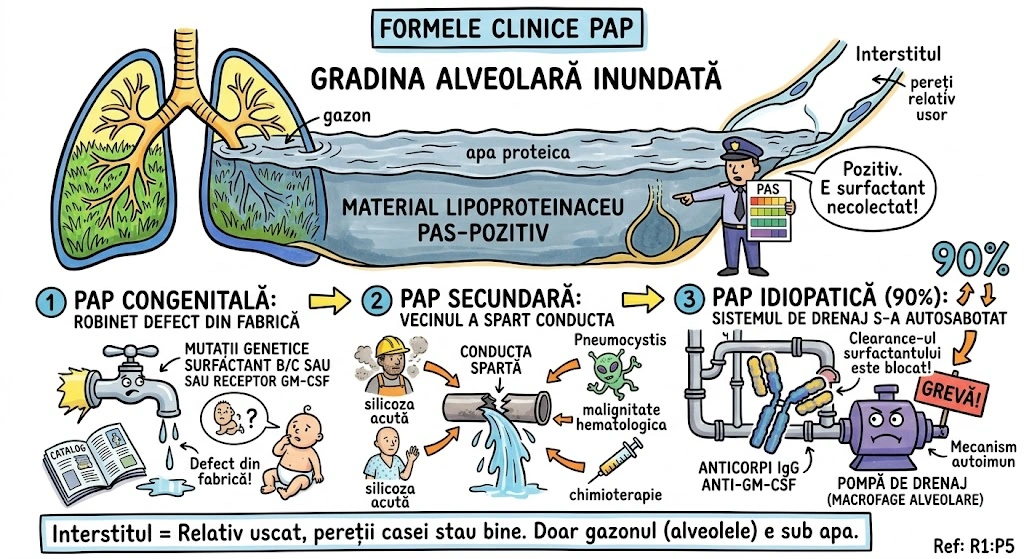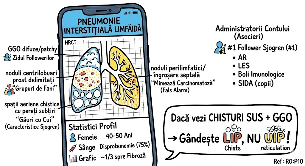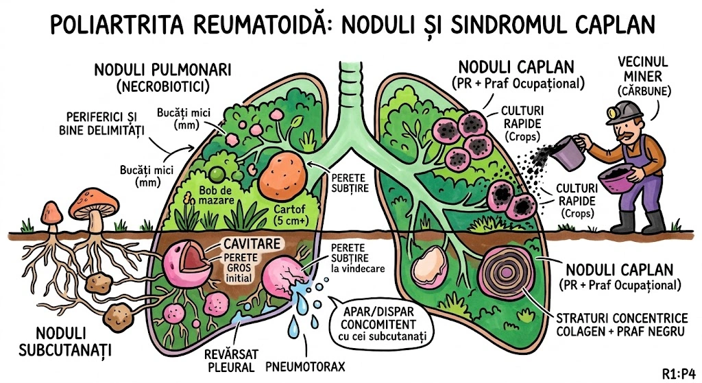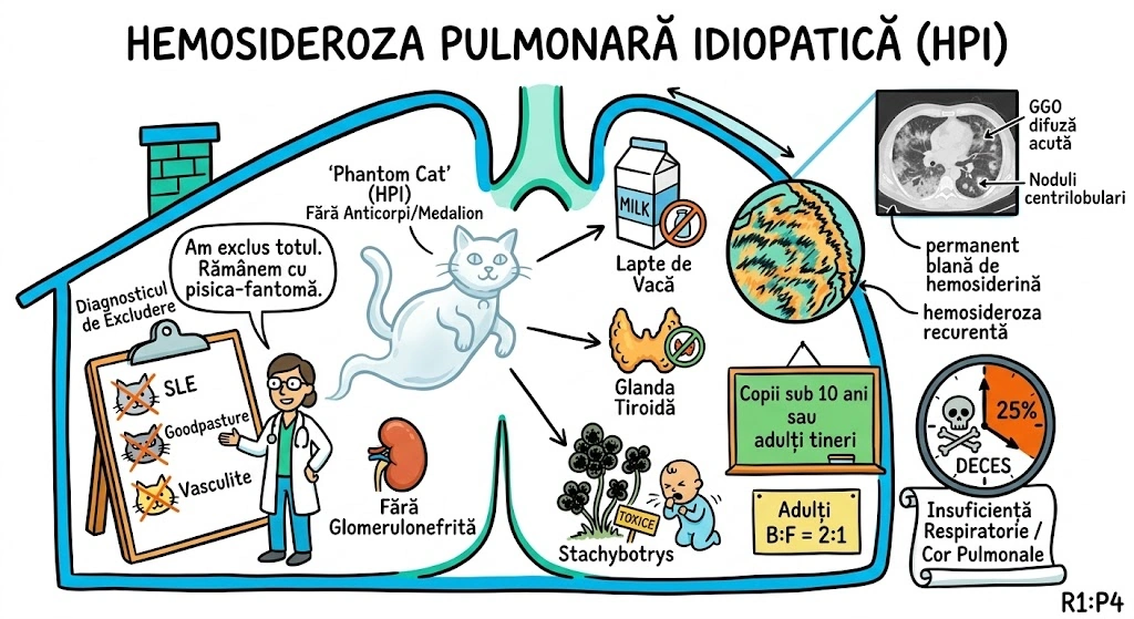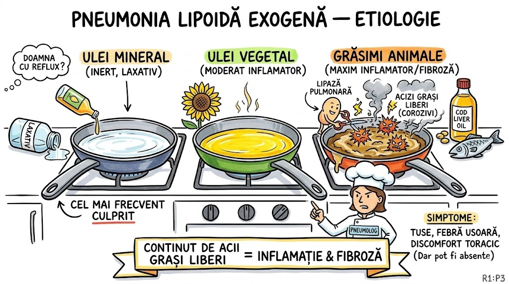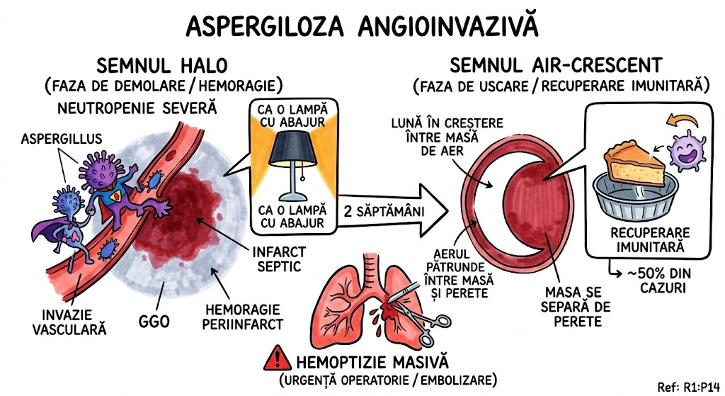 🥊 Ringul Comparatiilor: Consolidarea rapid aparuta (ore) vs. persistent cronica (4–6 saptamani) e diferenta intre un accident de masina si o rugina progresiva. Accidentul (edem, aspiratie, hemoragie) e brusc, dramatic, vizibil imediat. Rugina (eozinofilica, BOOP, carcinom) e lenta, insidioasa, descoperita intamplator. Ambele distrug masina, dar cronometrul iti spune cine e vinovatul.