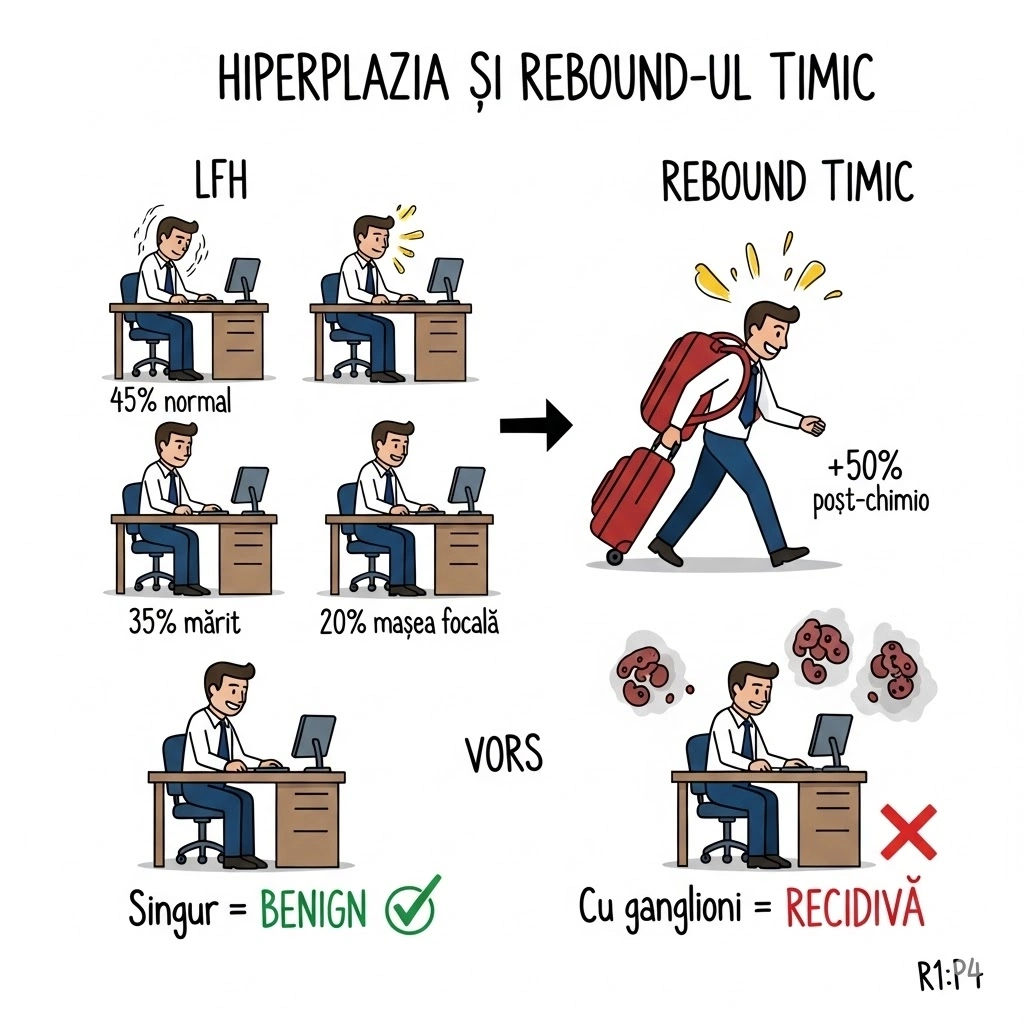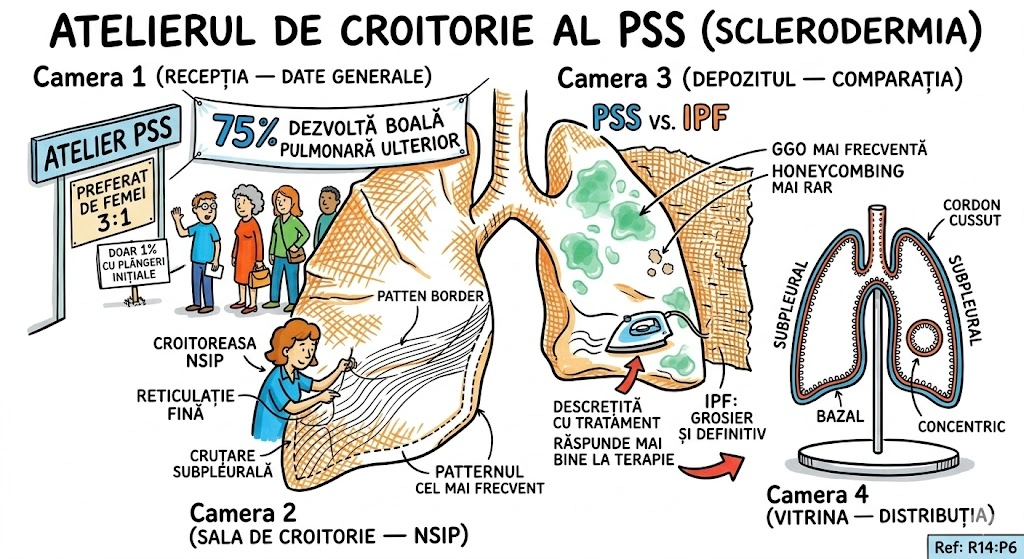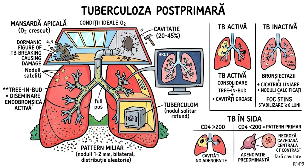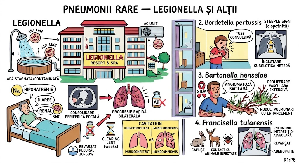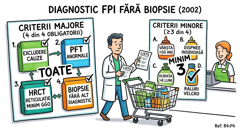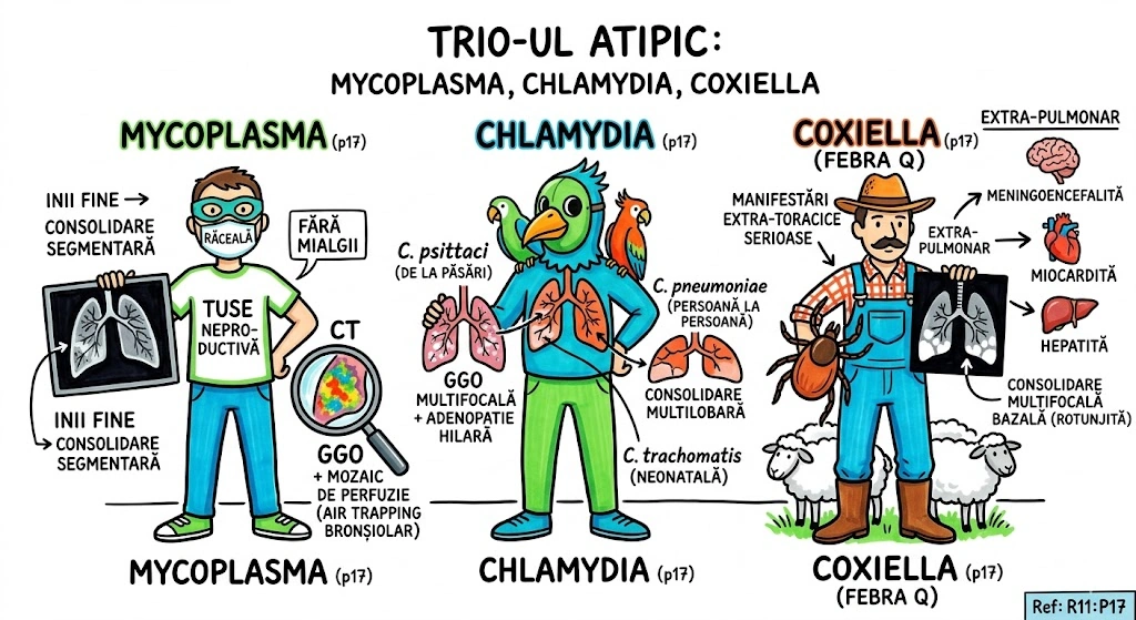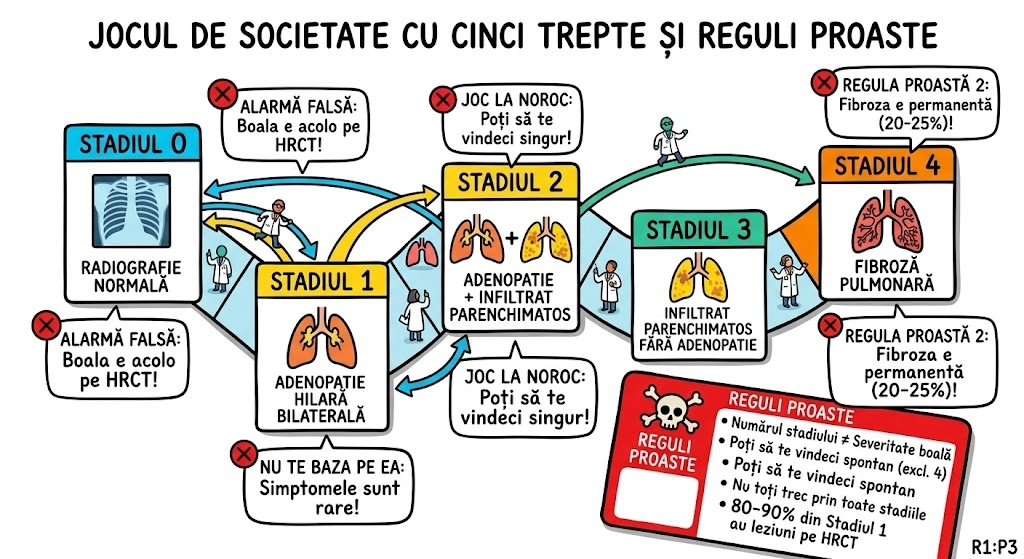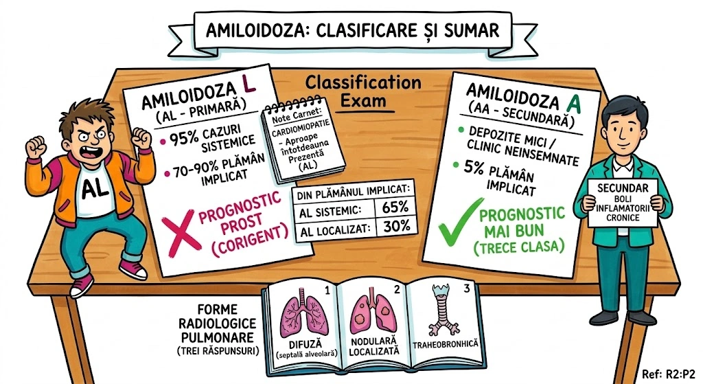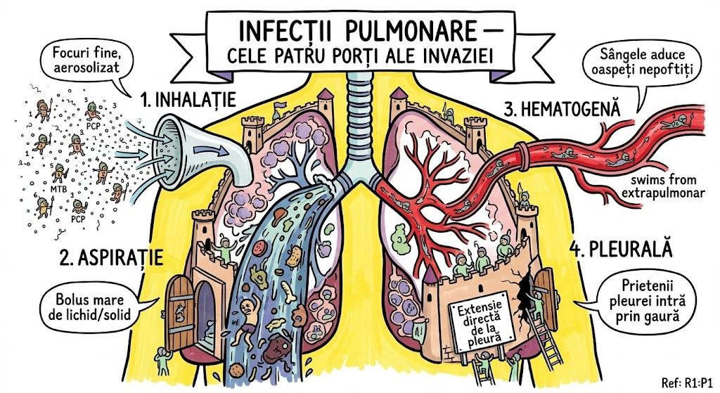 🥊 Ringul Comparatiilor: Consolidarea rapid aparuta (ore) vs. persistent cronica (4–6 saptamani) e diferenta intre un accident de masina si o rugina progresiva. Accidentul (edem, aspiratie, hemoragie) e brusc, dramatic, vizibil imediat. Rugina (eozinofilica, BOOP, carcinom) e lenta, insidioasa, descoperita intamplator. Ambele distrug masina, dar cronometrul iti spune cine e vinovatul.