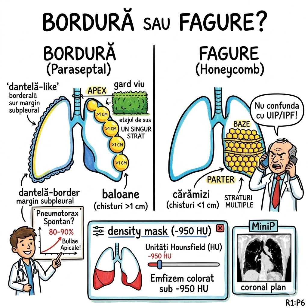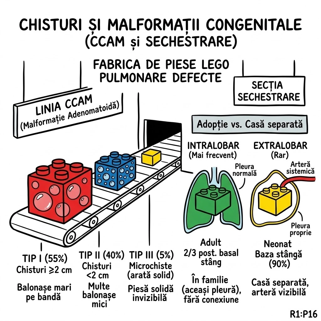 🥊 Ringul Comparatiilor: CCAM e ca un bloc de apartamente cu defecte structurale — chistul bronhogenic (p5) e o singura garsoniera gresit construita in alta parte a orasului. Diferenta fundamentala: CCAM e multichistica, dezorganizata, cu comunicare cu arborele bronsic si vascularizatie pulmonara; chistul bronhogenic e solitar, bine delimitat, fara comunicare. CCAM vine cu risc de malignizare pe termen lung — chistul bronhogenic nu.