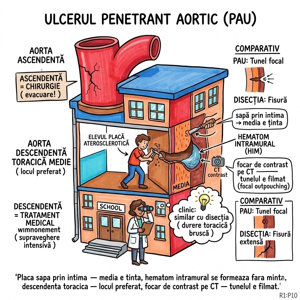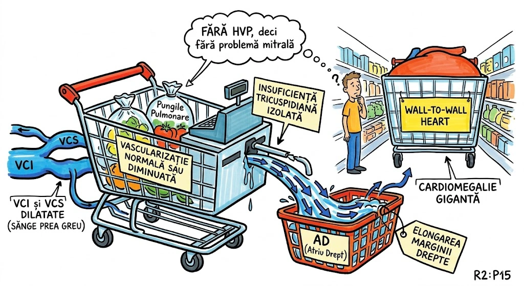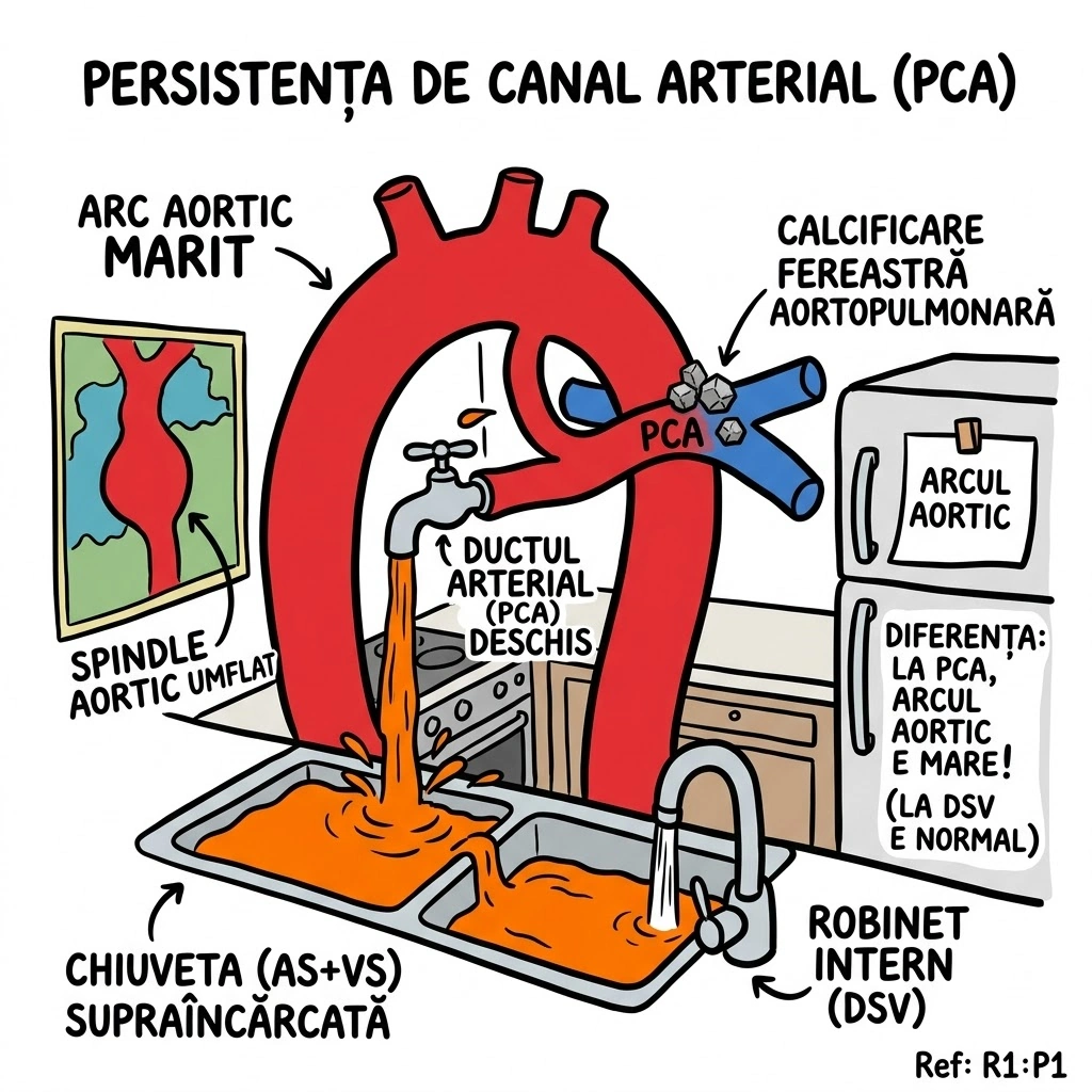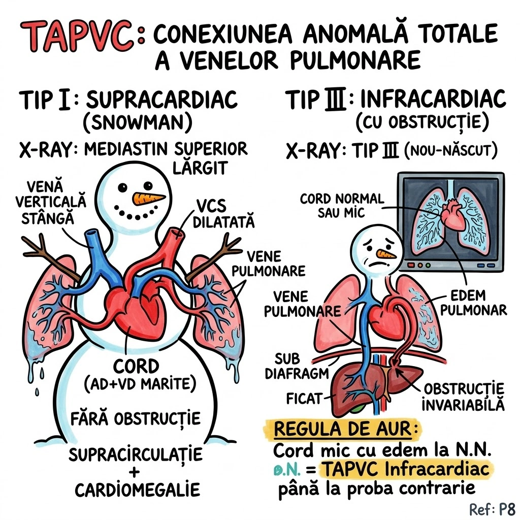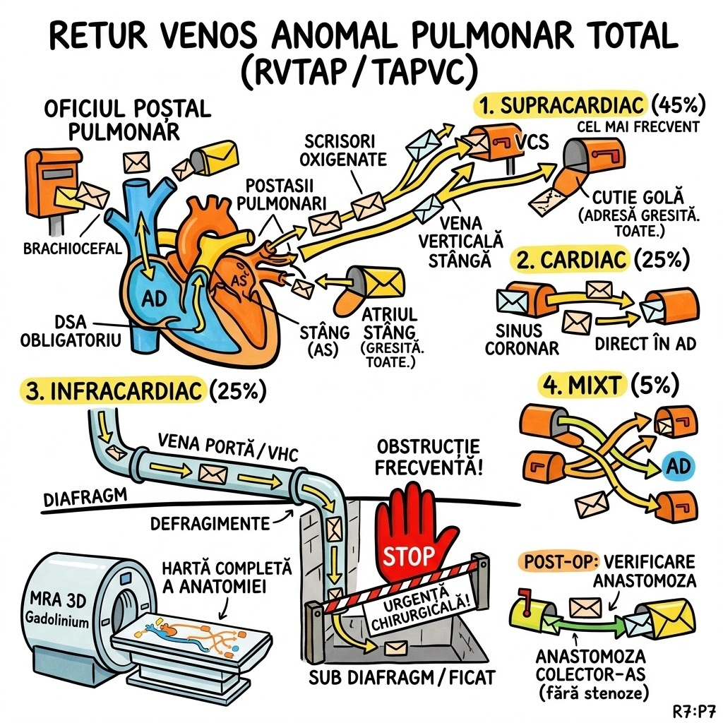 🥊 Ringul Comparatiilor: PAPVD e ca o livrare de colete unde 1-2 pachete din 20 ajung la vecin in loc de tine — de obicei nu observi lipsa. TAPVD e ca atunci cand intregul colet de la comanda online ajunge la o alta adresa si singura solutie e sa ai o cheie de la usa vecinului (defect septal). Sindromul scimitar (p9) e un PAPVD special — include scrisoarea gresita (vena scimitar) plus un curier suplimentar de la alt oras (artera sistemica din aorta).