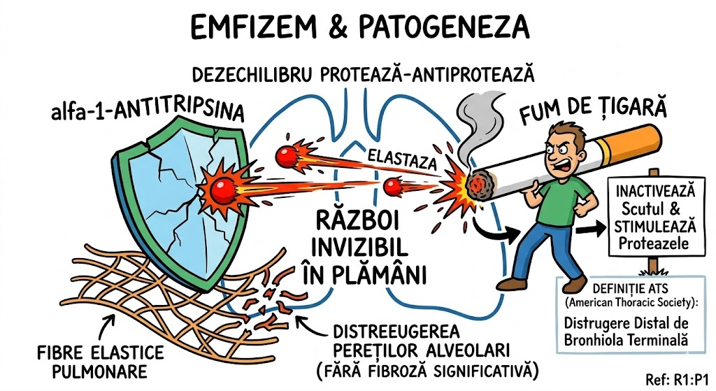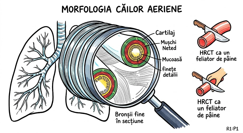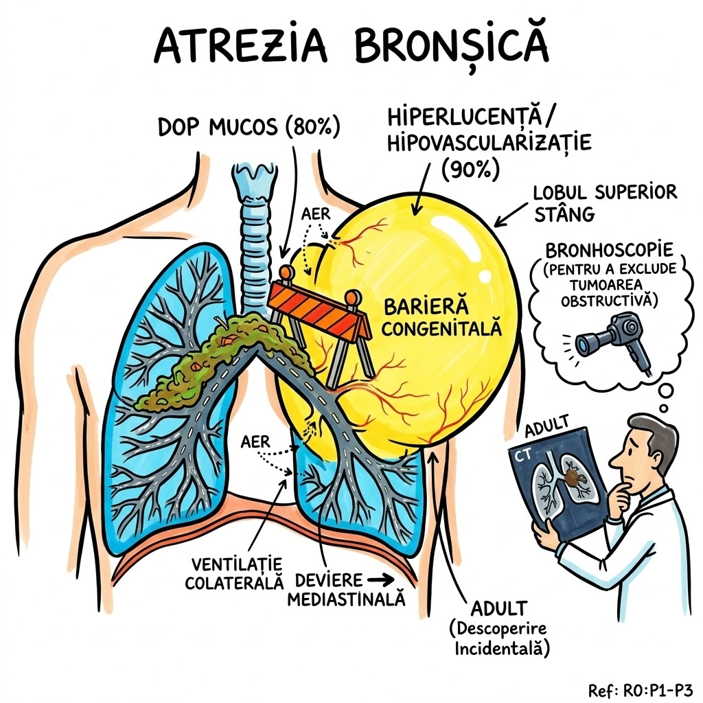 🥊 Ringul Comparatiilor: Atrezia bronsica e ca un drum national blocat de la constructie, unde gunoiul se acumuleaza dar aerul gaseste rute ocolite — spre deosebire de emfizemul lobar congenital (p4) unde drumul nu e blocat complet, ci are o bariera cu sens unic (obstructie de tip supapa — aerul intra dar nu mai iese). Ambele produc hiperinflatie, dar mecanismul si varsta la care deranjeaza sunt diferite.