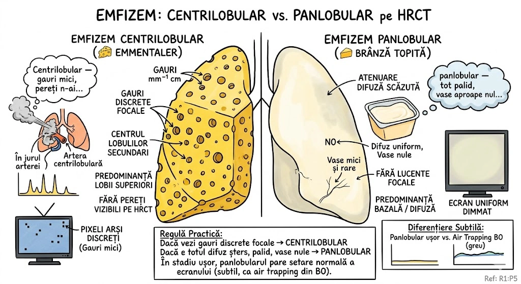 🥊 Ringul Comparatiilor: ELC la neonat e ca o petrecere cu baloane defecte — se umfla singure si nu se mai pot dezumfla. Atrezia bronsica (p3) la adult e ca acelasi balon gasit a doua zi — partial dezumflat, cu gunoaie in el (dop mucos), dar nimeni nu-si aminteste cine l-a umflat. Acelasi defect congenital, doua prezentari diferite in functie de momentul descoperirii.
