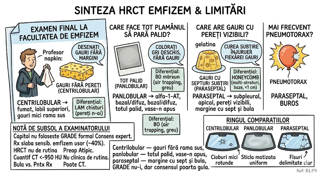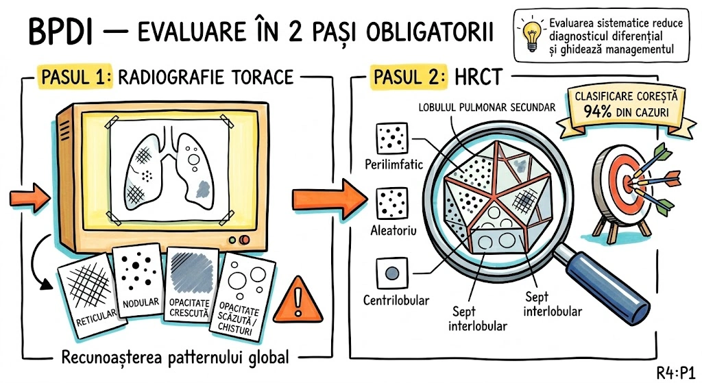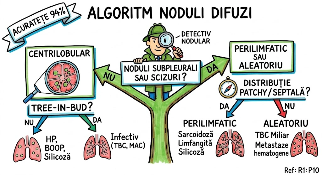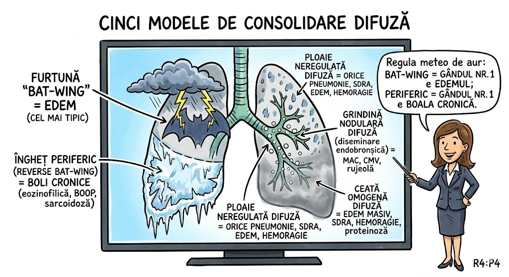 Ce Memoram: Cinci modele de consolidare difuza: (1) Perihilar „bat-wing" = edem (cel mai tipic); (2) Periferic subpleural = boli cronice (eozinofilica clasic, BOOP); (3) Difuz in pete = orice pneumonie, edem, SDRA; (4) Noduli aerospatiali difuzi = diseminare endobronsica; (5) Consolidare omogena difuza = edem, SDRA, hemoragie.