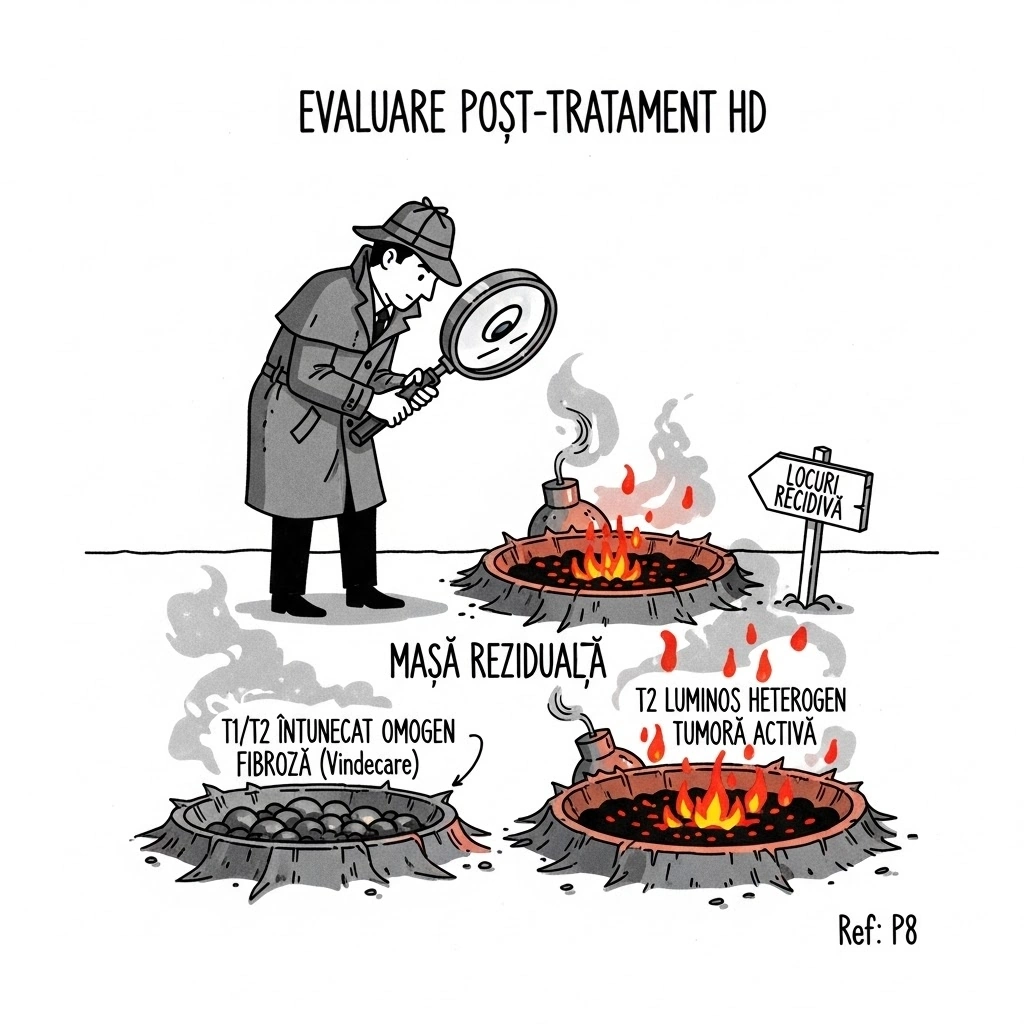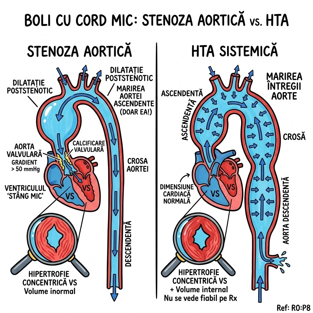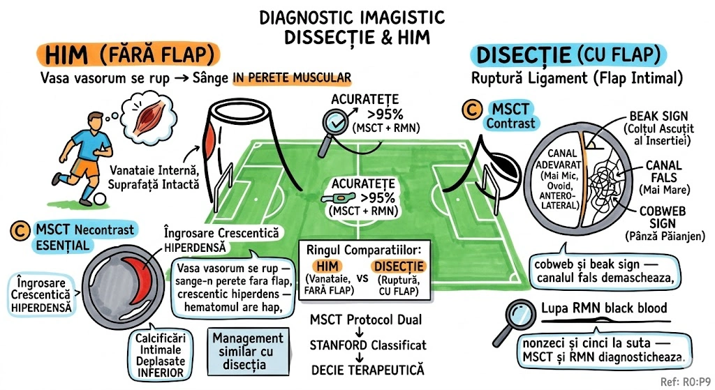 🥊 Ringul Comparatiilor: Feocromocitomul cardiac e ca o instalatie electrica defecta pe acoperisul casei — produce scurtcircuite (HTA prin catecolamine) si trebuie reparata urgent. Hemangiomul e ca un rezervor de apa in pivnita — plin cu canale, calcificari vechi, dar nu produce scurtcircuit electric. Ambele "instalatii" sunt pline de lichid (T2 hiperintens) si ambele absorb contrastul (Gd enhancement intens), dar doar instalatia defecta de pe acoperis face HTA.