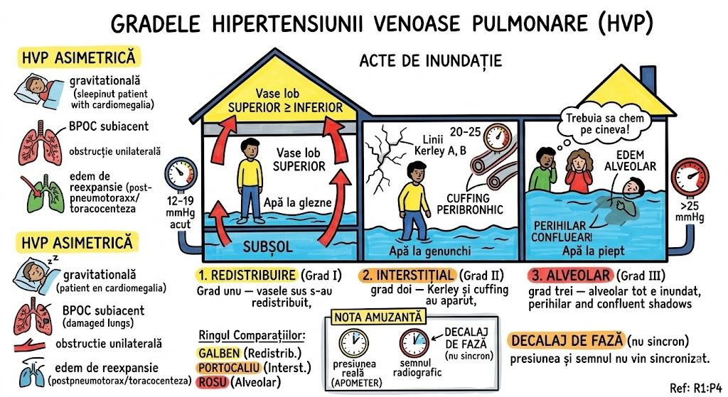Oficiul postal al sangvenei pulmonare — scrisorile (sangele oxigenat) ar trebui sa ajunga toate la aceeasi adresa (atriul stang). Varicele: o cutie postala umflata (vena dilatata) langa poarta principala (jonctiunea cu atriul stang) — congenitala (defect de constructie) sau dobandita (prea mult trafic postal — stenoza mitrala). Pe radiografie poate arata ca un colet suspect (nodul pulmonar). PAPVD: 0,5% din populatie are scrisorile livrate la adrese gresite — unele ajung la VCS, altele la vena azigos, la VCI sau direct la atriul drept. De regula nimeni nu se plange — descoperire asimptomatica. TAPVD: TOATE scrisorile ajung la adresa gresita — dar pentru ca posta sa functioneze, trebuie sa existe o usa secreta intre cele doua birouri postale (defect septal) — altfel, nimic nu mai ajunge unde trebuie.