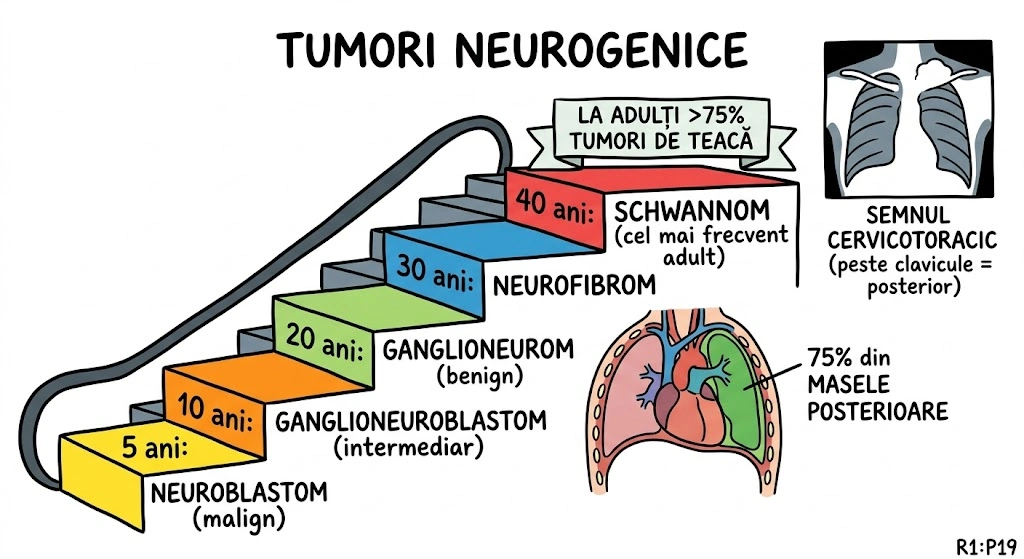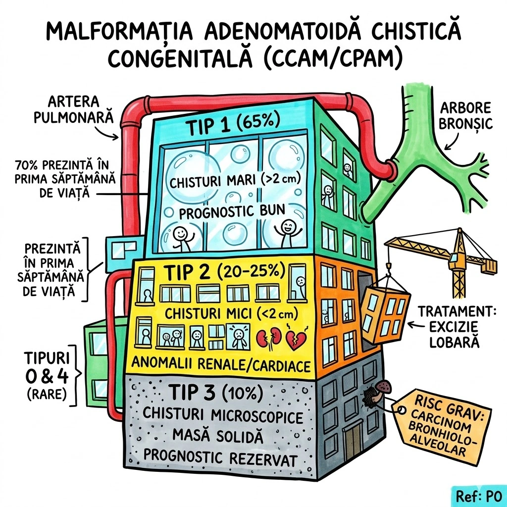Ce Memoram: Masa multichistica de tesut pulmonar dezorganizat. ~70% prezinta in prima saptamana de viata. 5 tipuri: Tip 1 (65%) — chisturi >2 cm, prognostic bun; Tip 2 (20-25%) — chisturi <2 cm, prognostic rezervat; Tip 3 (10%) — chisturi microscopice, masa solida; Tipuri 0 si 4 — rare. Tratament: excizie lobara. Complicatie rara dar grava: carcinom bronhiolo-alveolar pe fond de CCAM.