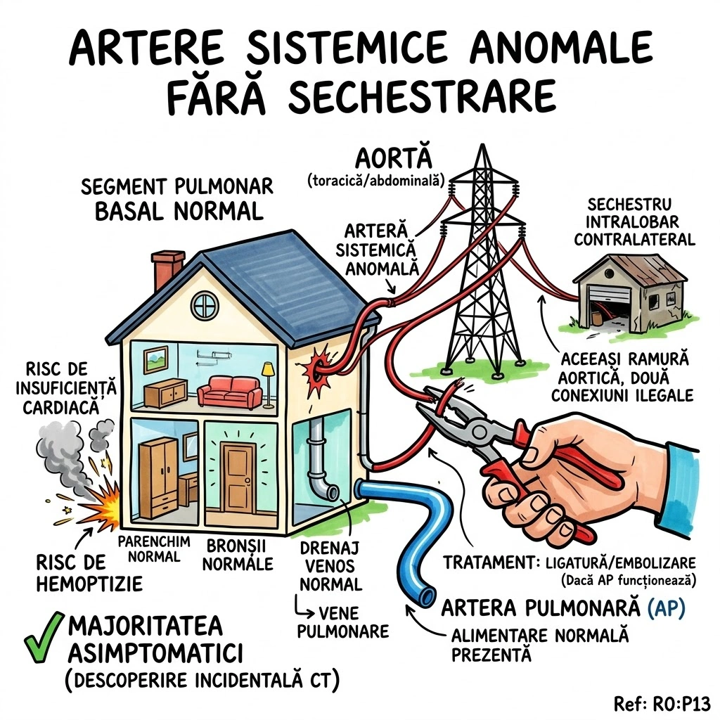 🥊 Ringul Comparatiilor: Artere sistemice anomale fara sechestrare sunt ca un cablu electric tras de la vecin — camera functioneaza normal, dar cu o sursa suplimentara ilegala. Sechestrul (p12) e ca un garaj construit fara autorizatie cu curent doar de la vecin — camera e complet dependenta de sursa externa si nu are propria instalatie (fara comunicare bronsica). Diferenta-cheie: aici plamanul e normal, acolo e dezorganizat.