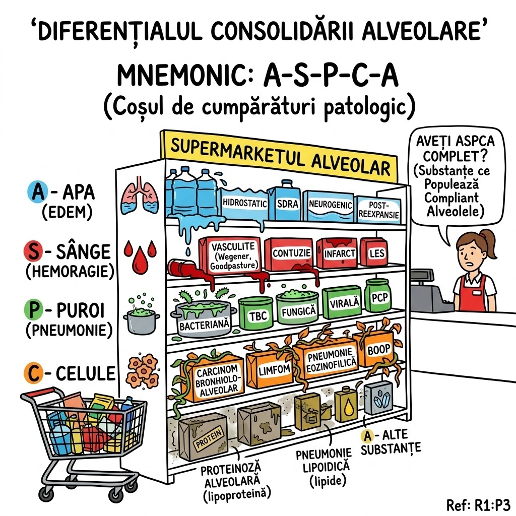 Cosul de cumparaturi patologic — cinci rafturi la supermarketul alveolar. Raftul A (Apa): edem hidrostatic, SDRA, edem neurogenic, edem post-reexpansie. Raftul S (Sange): hemoragie pulmonara, contuzie, infarct, vasculite (Wegener, Churg-Strauss), LES, Goodpasture, hemosideroza idiopatica. Raftul P (Puroi): pneumonie bacteriana, TBC, fungica, virala, PCP, atipica. Raftul C (Celule): carcinom bronhiolo-alveolar, limfom, pneumonie eozinofilica, BOOP, pneumonita de hipersensibilitate, PII. Raftul A2 (Alte): proteinoza alveolara (lipoproteina), pneumonie lipoidica (lipide). Acronimul cosului: ASPCA — Asociatia Substantelor ce Populeaza Compliant Alveolele.