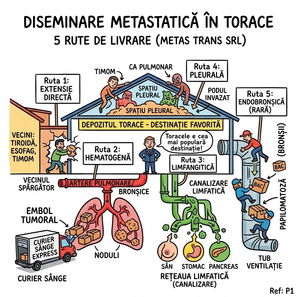 Trei rute de calatorie prin care turistii maligni ajung la inima. Ruta 1 — Extensia directa (autostrada intratoracica): cancerul pulmonar, timomul malign si mezotelionul cresc local si "merg pe jos" pana la inima — sunt deja in vecinatate. Ruta 2 — Extensia transvenoasa (autostrada fluviala prin VCI): carcinomul hepatocelular, renal si adrenal isi trimit prelungiri prin VCI ca un sarpe care urca pe rau pana in AD. Evaluarea unde se termina sarpele (atashamentul la peretele AD) decide daca chirurgul poate opera sau nu. Ruta 3 — Metastazele hematogene (autostrada aeriana): melanomul, leucemia, limfomul, cancerul pulmonar si mamar trimit celule prin sange. Melanomul detine recordul: cea mai mare frecventa de metastazare cardiaca. Semnul distinctiv RMN al melanomului: T1 inalt datorita melaninei paramagnetice — nu trebuie confundat cu lipomul (p5), care are tot T1 inalt dar dispare pe fat-sat.