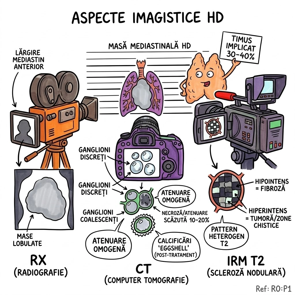Rabdomiosarcomul este cel mai frecvent tumor malign cardiac la copii. Poate aparea oriunde in miocard; este frecvent multiplu. Semnal variabil pe RMN; patchy hyperenhancement post-Gd; necroze cu semnal heterogen. Alte sarcoame (fibrosarcom, osteosarcom, leiomiosarcom, liposarcom): sunt rare. T1: izodens miocardului; T2: hiperintens; enhancement post-Gd prezent — trasaturi nespecifice. Limfomul primar cardiac: rar, apare mai ales la imunocompromisi; aproape exclusiv limfom B-celular. Limfomul secundar (extensie de la LH sau LNH): mai frecvent. Localizare predilecta: AD, dar si alte camere. Efuziune pericardica mare frecventa. T1: hipointens fata de miocard; T2: hiperintens; enhancement post-Gd variabil. Important clinic: diagnosticul precoce si chimioterapia sunt eficiente — limfomul cardiac primar este una dintre putinele tumori maligne cardiace cu raspuns terapeutic semnificativ.
