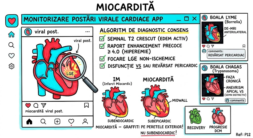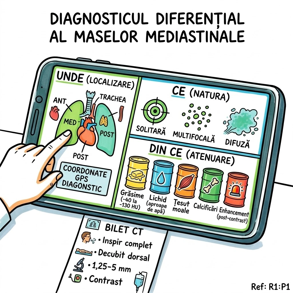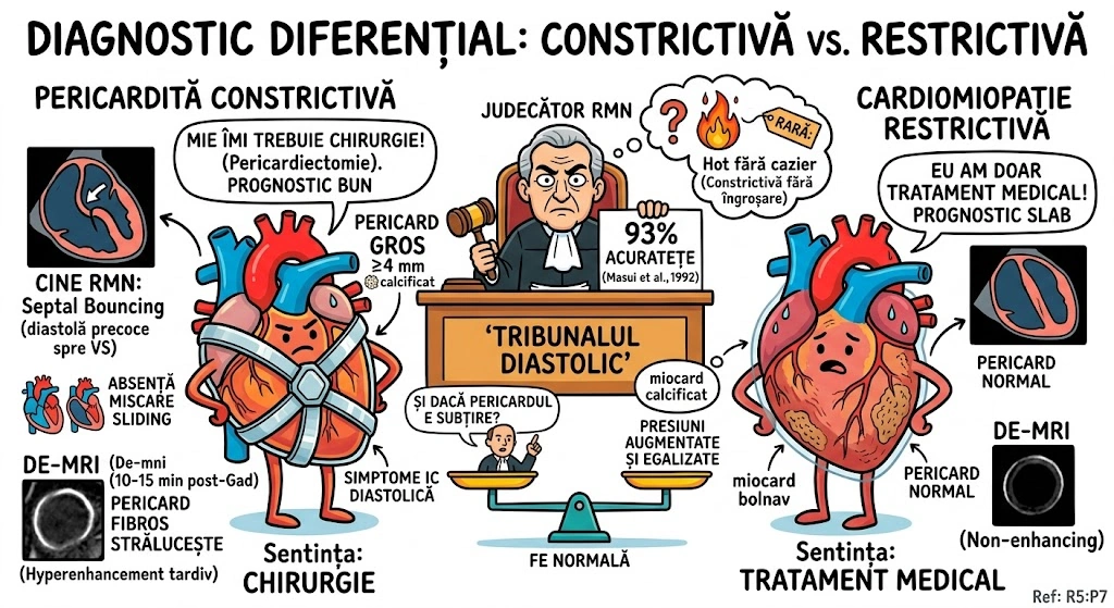 🥊 Ringul Comparatiilor: Tabelul diagnostic pericardic e similar cu un meniu de restaurant in care toate preparatele arata la fel la prima vedere, dar ingredientele difera radical: pericardita acuta si constrictiva au ambele pericard gros, dar una enhanceaza precoce si cealalta tardiv. Efuziunea simpla si hemopericardium au ambele lichid, dar densitatea CT le separa (<20 vs. >40-45 UH). Chistul si tumora arata identic pe T1 daca chistul e proteinos — dar gadoliniul e chelnerul care stie ce e in farfurie.
