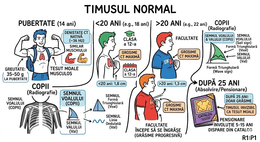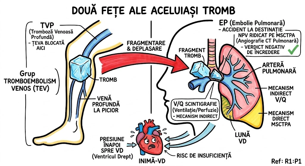 🥊 Ringul Comparatiilor: Trombul recent (T1+T2 inalt) vs. trombul vechi (T1+T2 scazut) functioneaza ca un semafor care se schimba cu timpul: initial e pe verde (semnal inalt — proaspat, activ, periculos embolic), apoi trece pe galben (intermediar), apoi pe rosu (semnal scazut — vechi, organizat, stabil). Acelasi obiect, semnal complet diferit in functie de timp. Timpul schimba diagnosticul imagistic fara sa schimbe diagnosticul clinic — ramane tromb.
