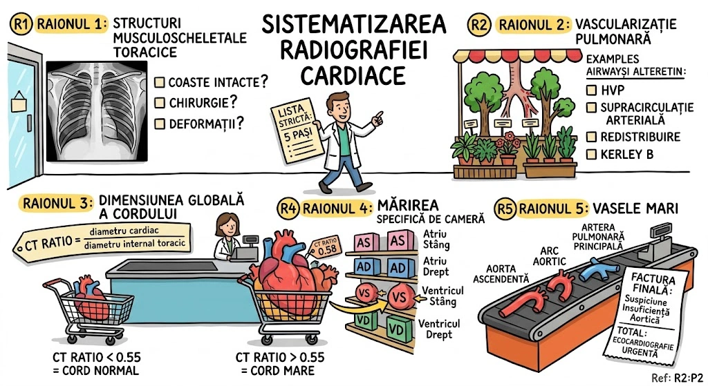 Esti la supermarketul de imagistica cardiaca. Cosul tau are loc pentru exact 5 produse. Le iei in ordine: Identificare, Extensie, Benign-vs-Malign, Primar-vs-Secundar, Tumora-vs-Tromb. Ajungi la casa, scanezi tot cosul — si casierul iti spune: "Stiti, 97% din clientii nostri pleaca de aici cu trombi in cos, nu cu tumori primare. Tumorile primare sunt pe raftul de raritati — cel de sus, unde nu ajunge nimeni fara scara." Iti amintesti ca termenul corect e "masa", nu "tumora" — pentru ca trombul e regele raionului intracardiac. Tumorile secundare sunt de 40 de ori mai frecvente decat cele primare. Practic, inima e un loc in care toti vin in vizita, dar aproape nimeni nu se naste acolo.