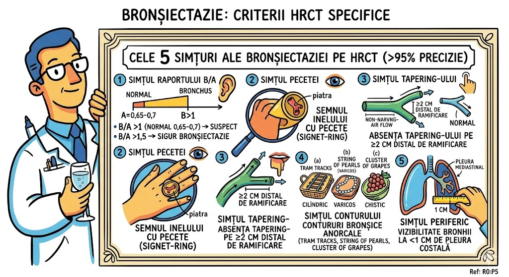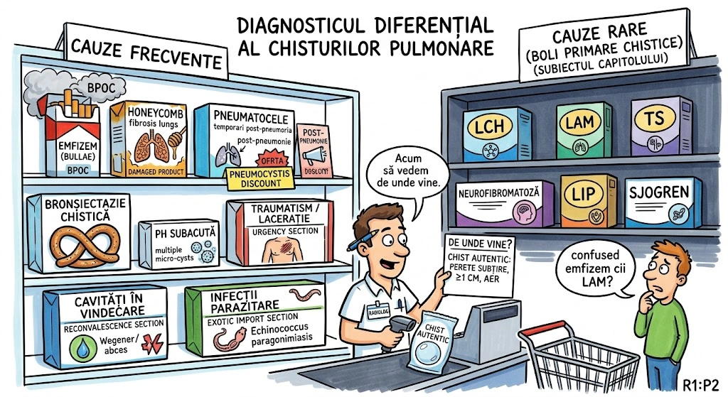 🥊 Ringul Comparatiilor: Chistul bronhogenic pulmonar e ca un borcan de conserve gasit la curatenia de primavara din pivnita — nu stii ce e inauntru pana nu il deschizi (sau pana se infecteaza singur). Diferenta fata de CCAM/CPAM (p6): borcanul e singular si bine delimitat; CCAM e o intreaga debara plina de borcane de marimi diferite, unele microscopice, toate intr-o dezordine congenitala.